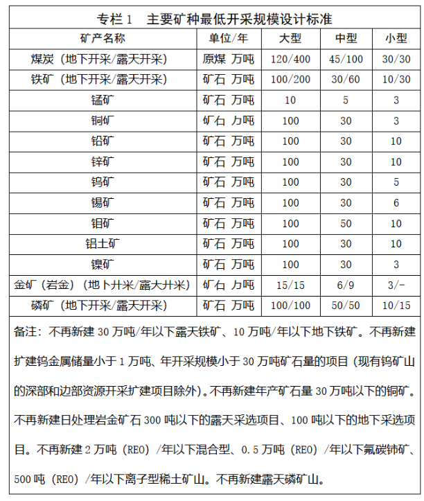 落实全国矿产资源规划有关要求,新建、扩建矿山严格执行规划确定的矿山最低开采规模和最低服务年限。产业政策准入要求高于最低开采规模设计标准的,以产业政策为准。