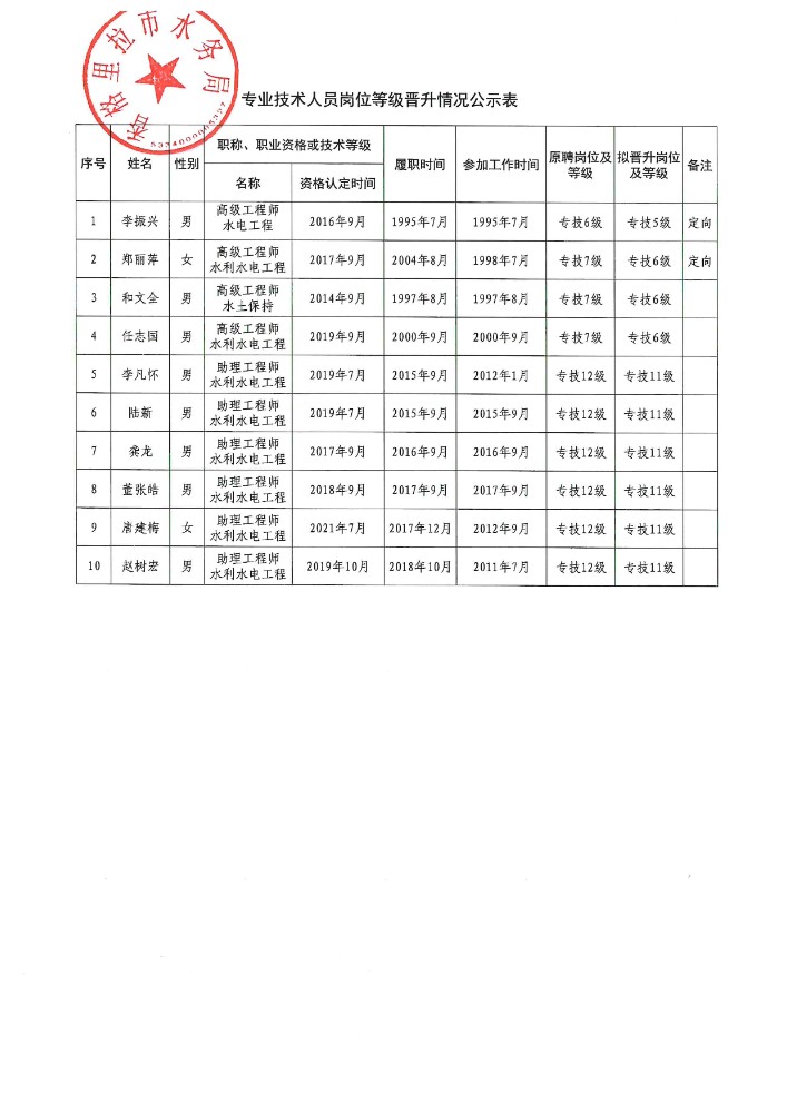 香格里拉市水务局关于局属事业单位2022年度专业技术岗位等级晋升人员名单的公示