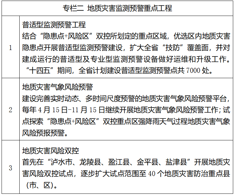 ——监测预警精度和风险防范能力显著提升。部署地质灾害普适型监测预警点建设7000处,完善地质灾害气象风险预警系统,建设“人防+技防”的地质灾害综合监测预警体系;选择40个地质灾害防治重点县(市、区),探索“隐患点+风险区”双控管理制度、责任体系和技术方法,显著提升地质灾害风险防范能力。