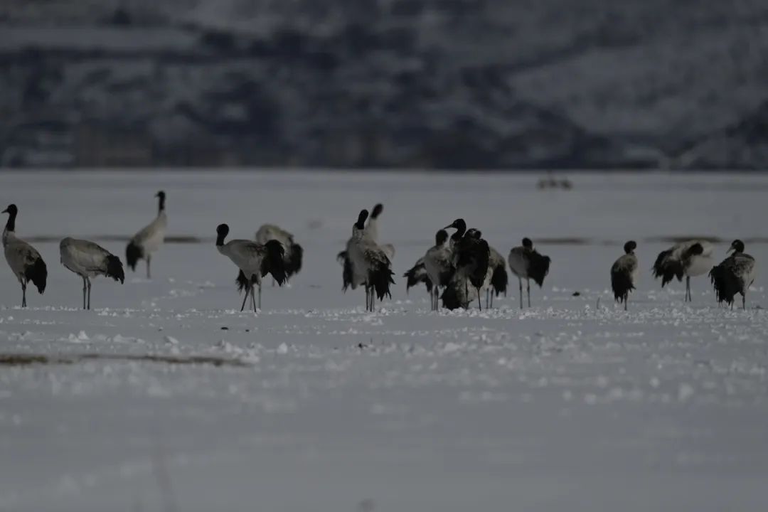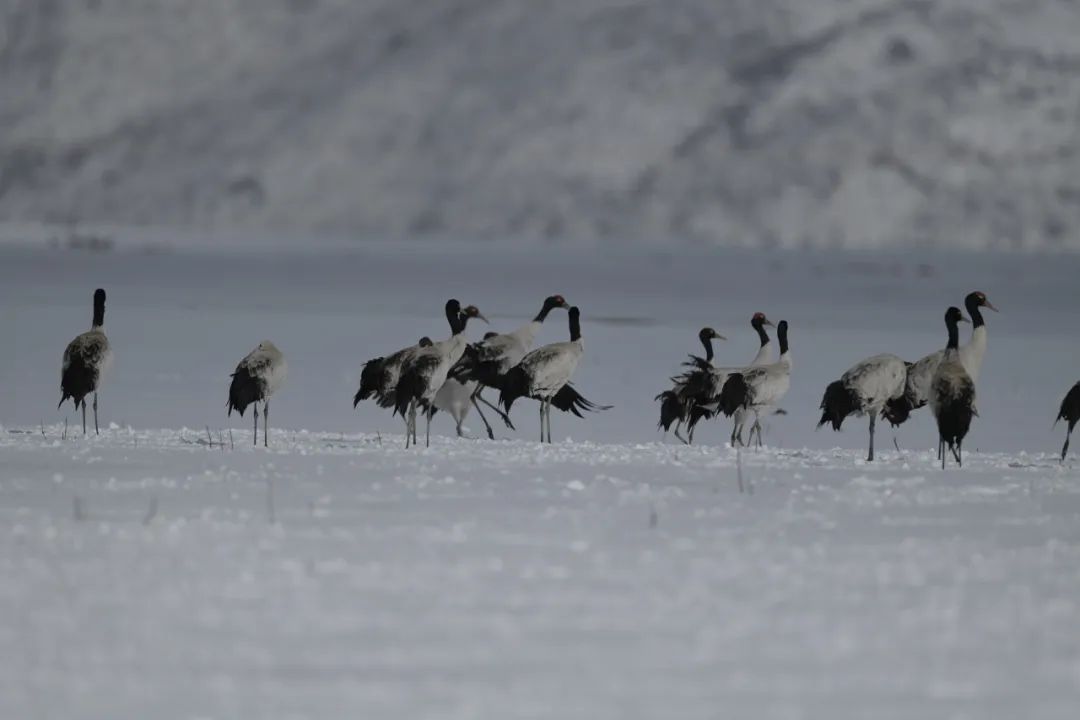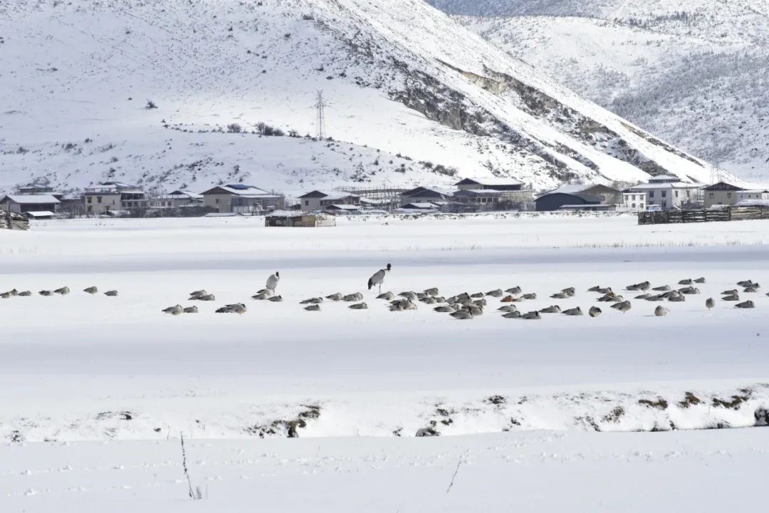12月14日,香格里拉迎来入冬以来最大的一场雪,纳帕海国际重要湿地银装素裹,成群结队的黑颈鹤在雪中嬉戏,成为一道格外靓丽的风景线。