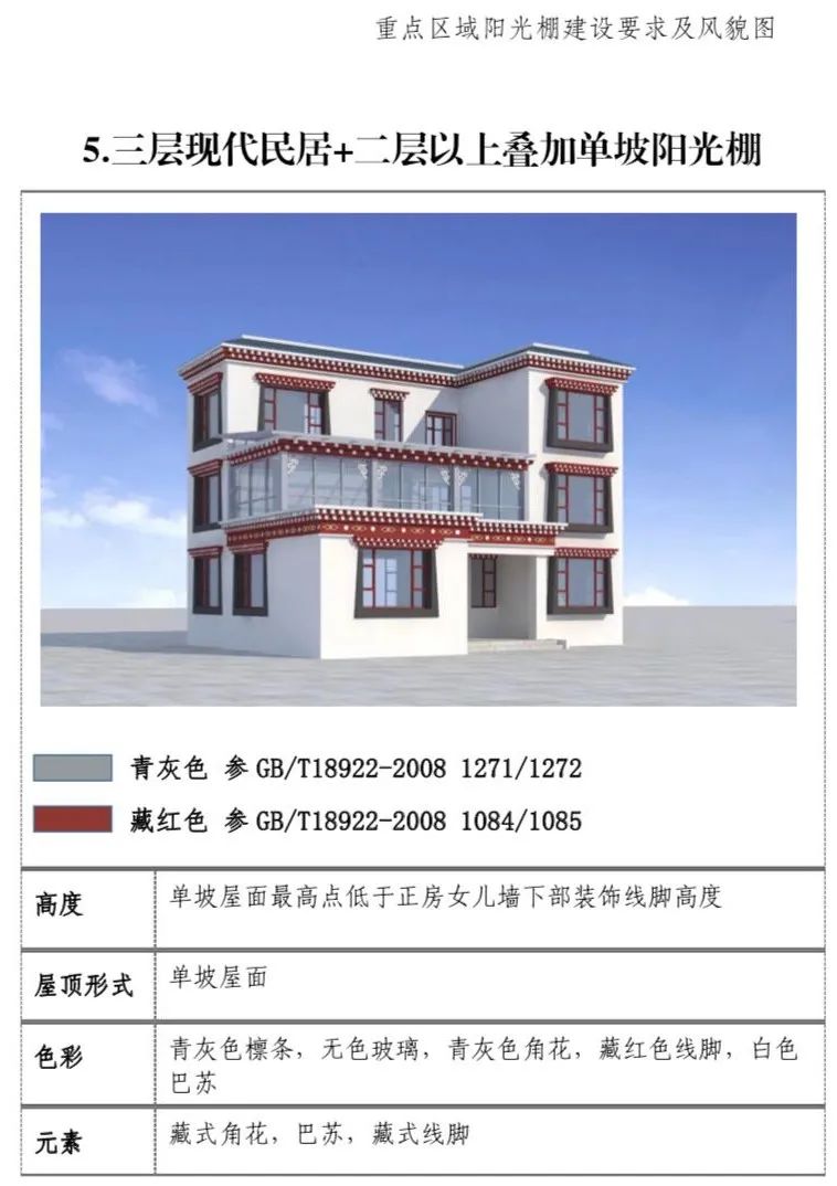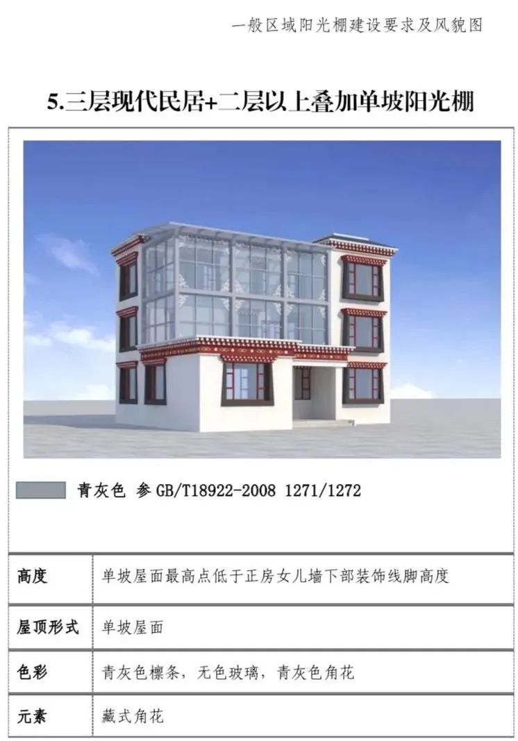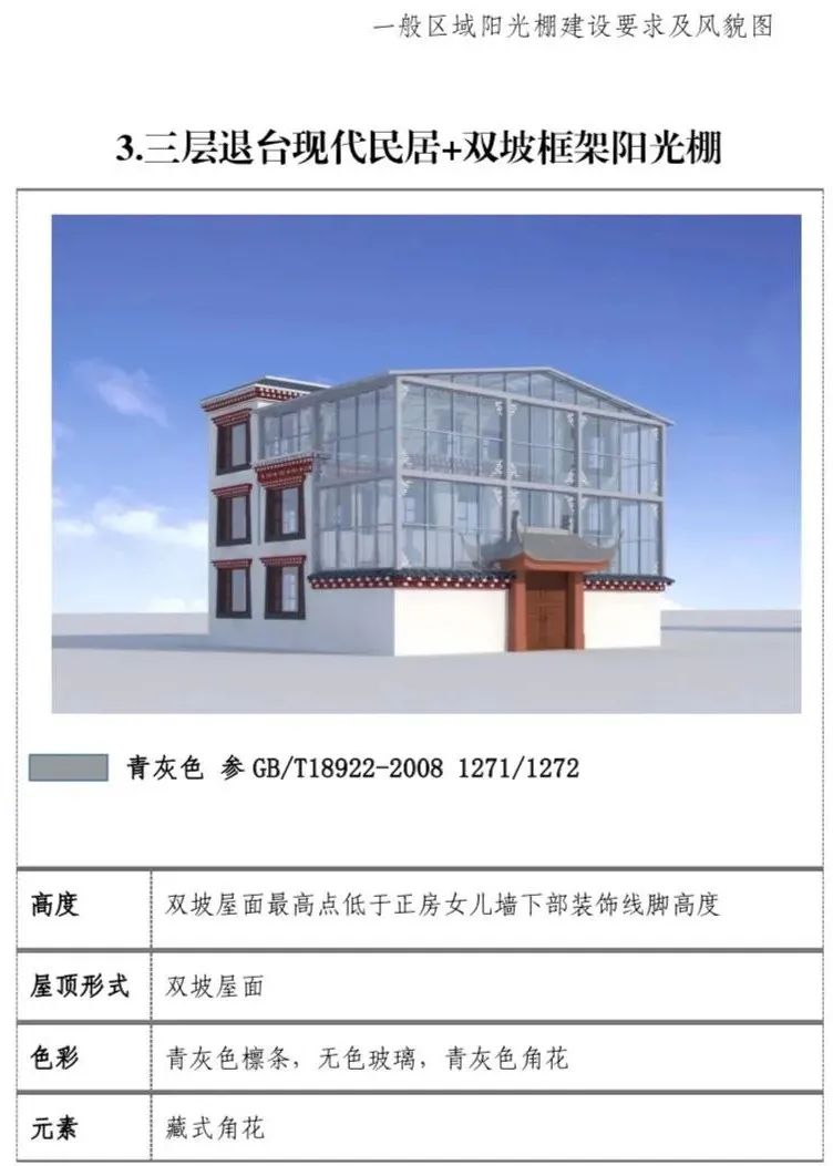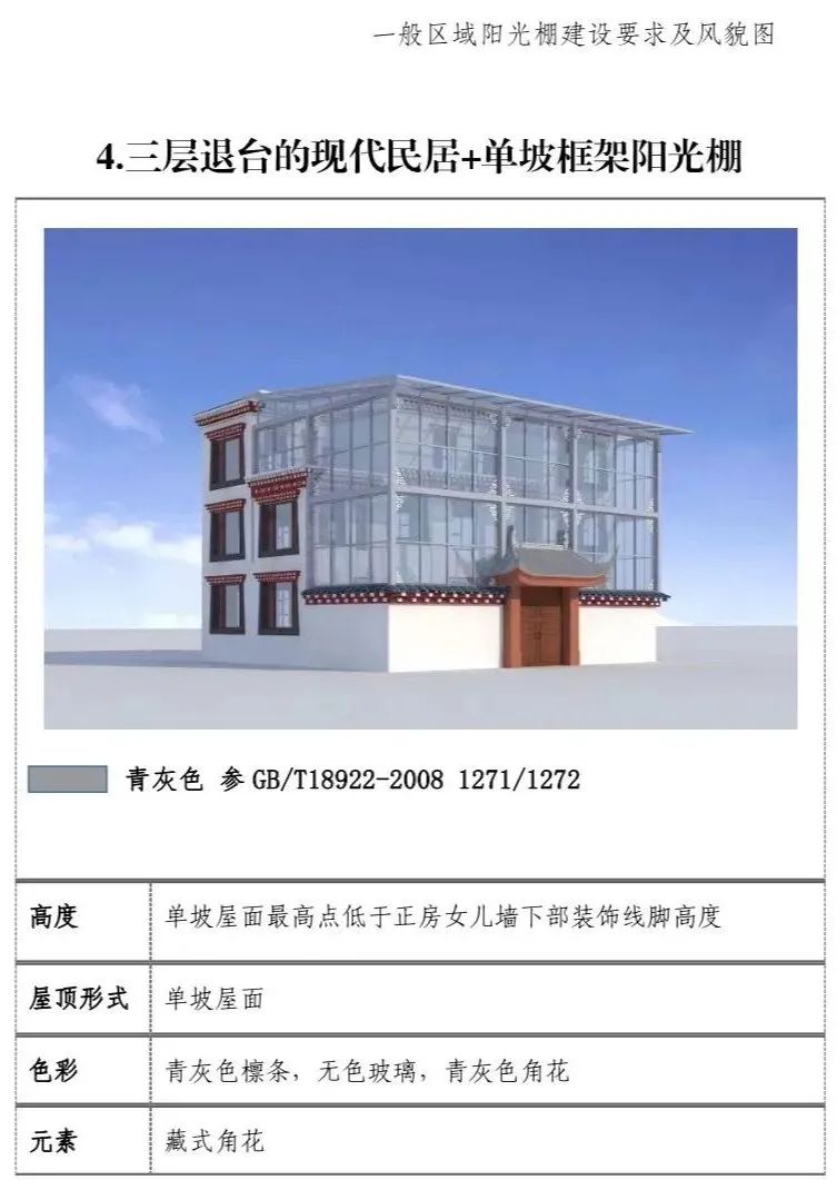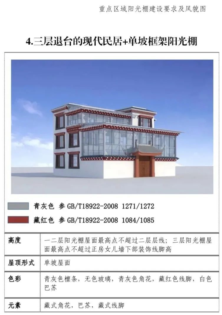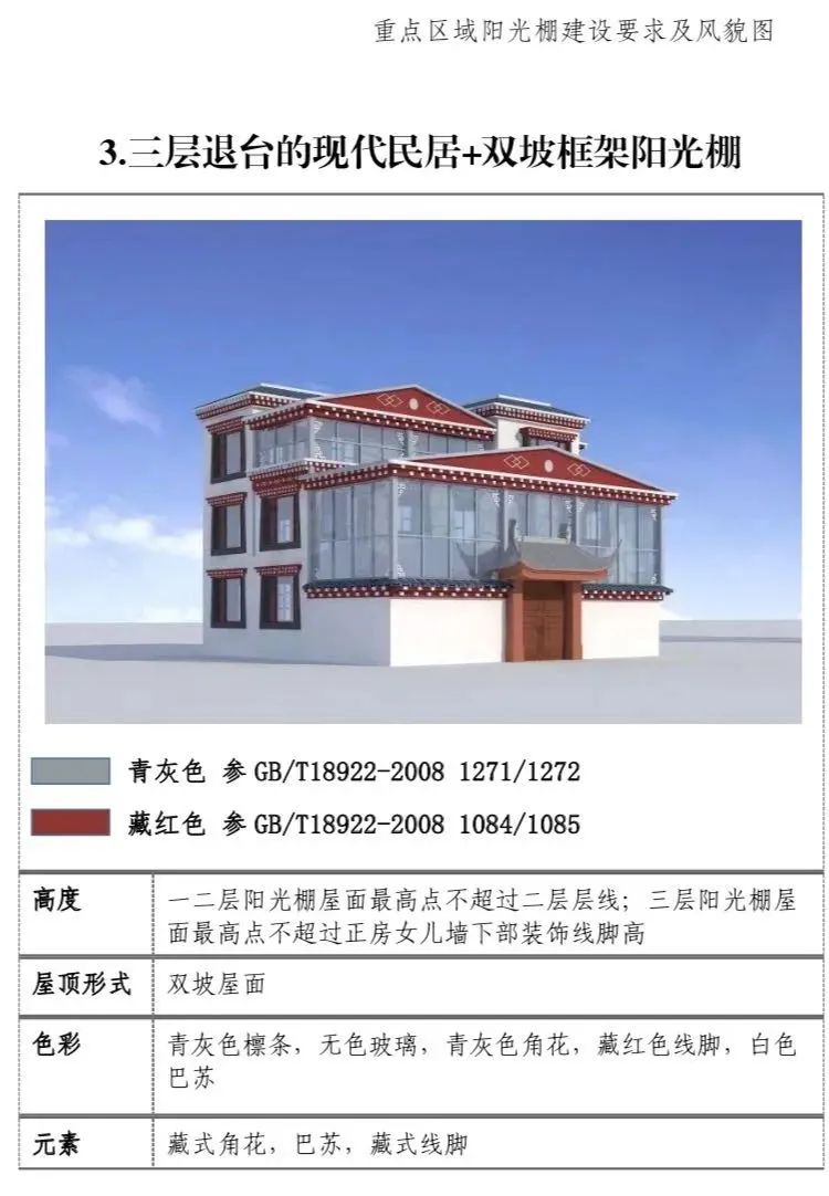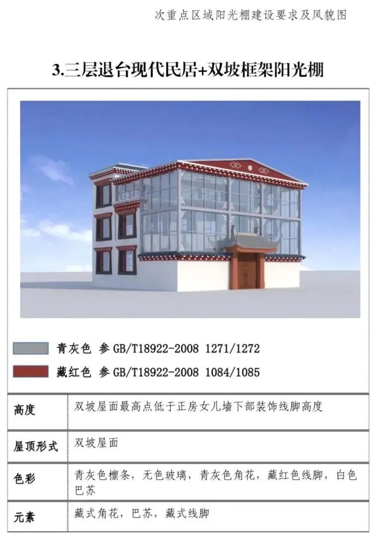 现代民居:新建阳光棚最高两层,第三层阳光 棚单独设置。一二层阳光棚屋面最高点低于三层层线,三层阳光棚屋面最高点不超过正房女儿墙下部装饰线脚高度。(2)屋顶形式:单坡屋顶为主,双坡屋顶为辅。(3)装饰元素:设置藏式角花,巴苏以及线脚。(4)色彩:青灰色和藏红色。