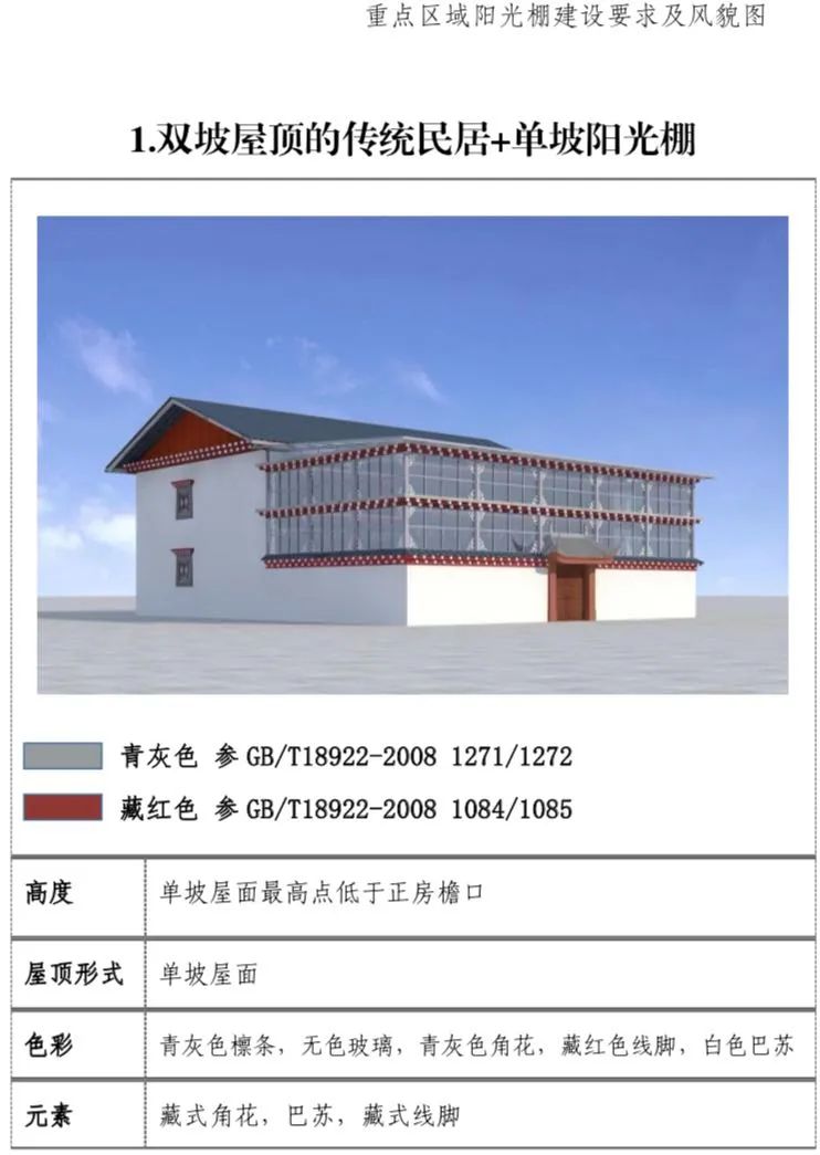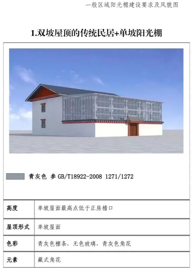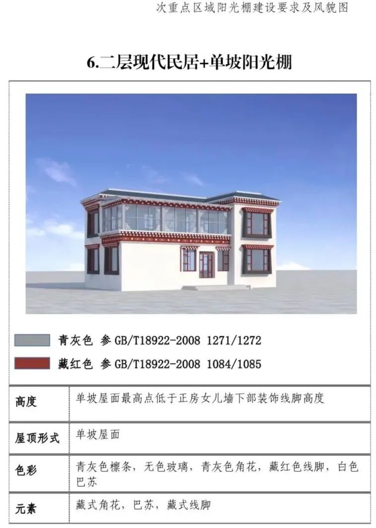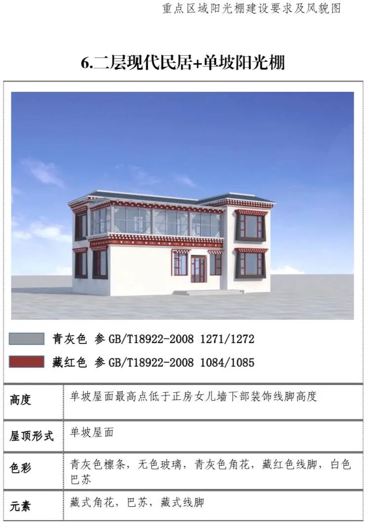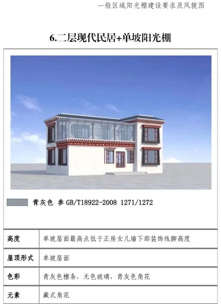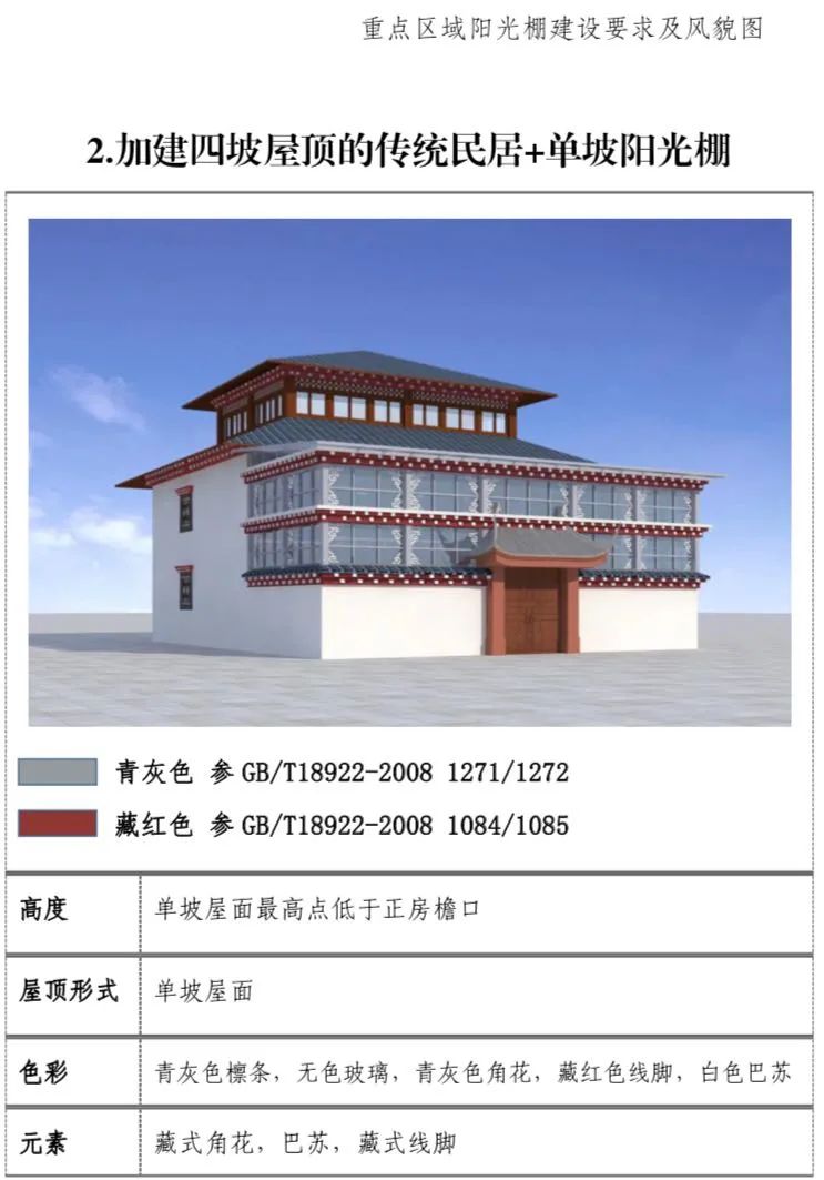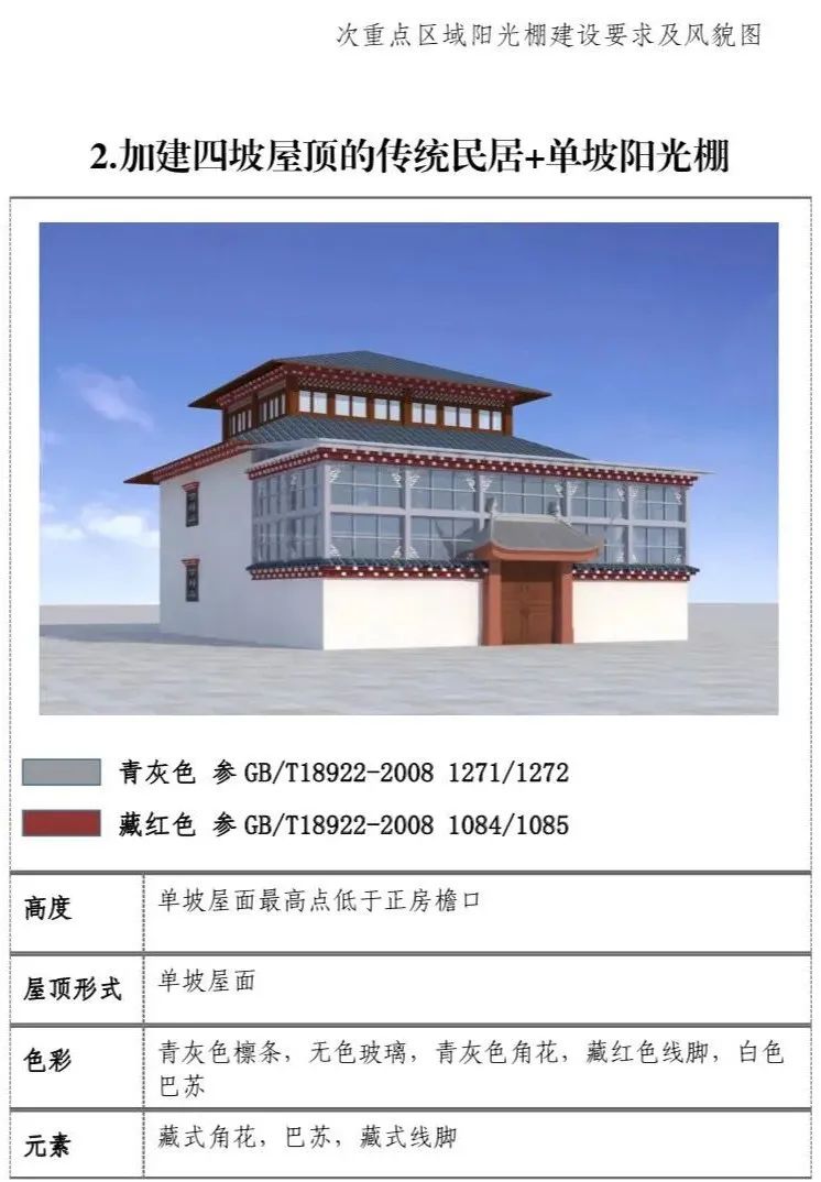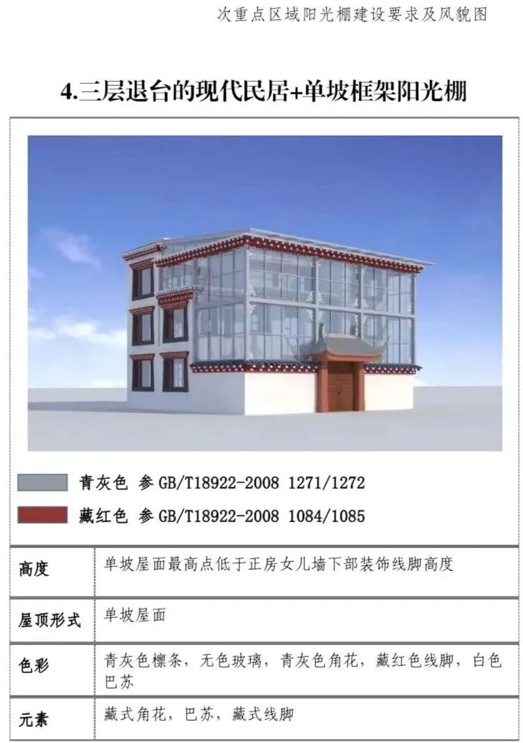 现代民居:新建阳光棚最高两层,第三层阳光 棚单独设置。一二层阳光棚屋面最高点低于三层层线,三层阳光棚屋面最高点不超过正房女儿墙下部装饰线脚高度。(2)屋顶形式:单坡屋顶为主,双坡屋顶为辅。(3)装饰元素:设置藏式角花,巴苏以及线脚。(4)色彩:青灰色和藏红色。