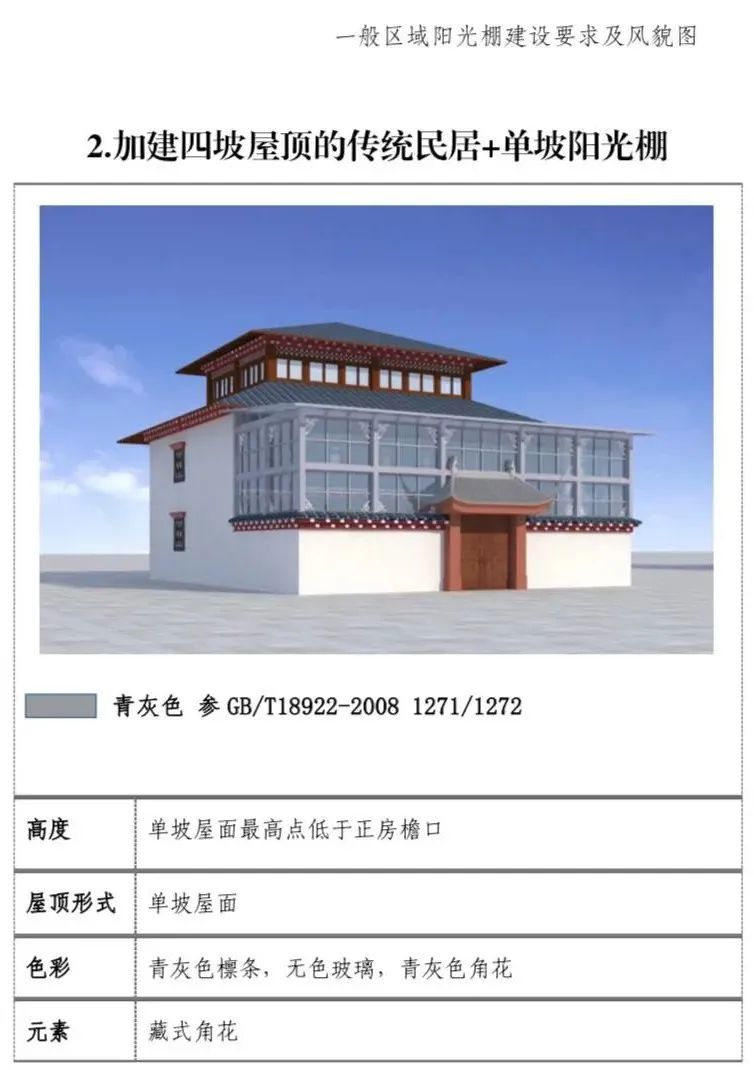 附图3 次重点区域阳光棚建设要求及风貌图 次重点区域 控 “控”主要指新建、改建阳光棚符合所在分区的基本要求,特别是高度要求。新建、改建阳光棚应单独至香格里拉市阳光棚专项治理工作领导小组审批,不允许私自建设。 次重点区域内新建建筑以 “ 控 ” 为主。 (1)体量 (以风貌图为例) :长宽不超过主体建筑或主体建筑与围墙围合范围。 要求 (2)屋顶形式:单坡屋顶为主,双坡屋顶为辅。 (3)装饰元素:设置藏式角花,巴苏以及线脚。 (4)色彩:青灰色和藏红色。 附图4 一般区域阳光棚建设要求及风貌图 一般区域 控 “控”主要指新建、改建阳光棚符合所在分区的基本要求,特别是高度要求。新建、改建阳光棚应单独至香格里拉市阳光棚专项治理工作领导小组审批,不允许私自建设。 一般区域内新建建筑以 “ 控 ” 为主。 (1) 体量 ( 以风貌图为例 ) :长宽不超过主体建筑或主体建筑与围墙围合范围。 要求 高度:传统民居:新建阳光棚最高两层,阳光棚屋面最高点不超过正房檐口。 现代民居 :新建阳光棚最高三层,阳光棚屋面最高点不超过正房女儿墙下部装饰线脚高度。 (2)屋顶形式:单坡屋顶为主,双坡屋顶为辅。 (3)装饰元素:仅设置藏式角花。 (4)色彩:青灰色。