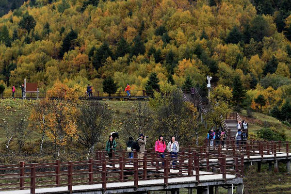 10月13日,一些游客在云南香格里拉普达措国家公园里体验迷人秋色。