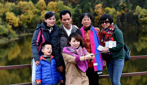 10月13日,游客在云南香格里拉普达措国家公园里自拍留影。