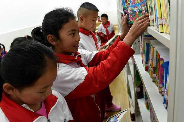3月27日,独克宗小学的9岁藏族女学生扎西央宗(中)在学校的图书室里选书。