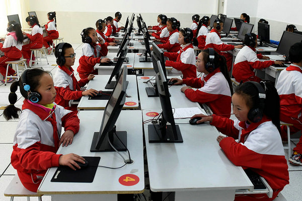 3月27日,独克宗小学的学生在上计算机课。
