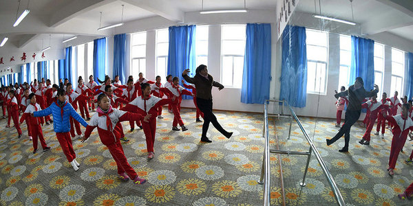 3月27日,独克宗小学的藏族教师陶志花(右)在学校的舞蹈教室里带着学生跳民族舞蹈。