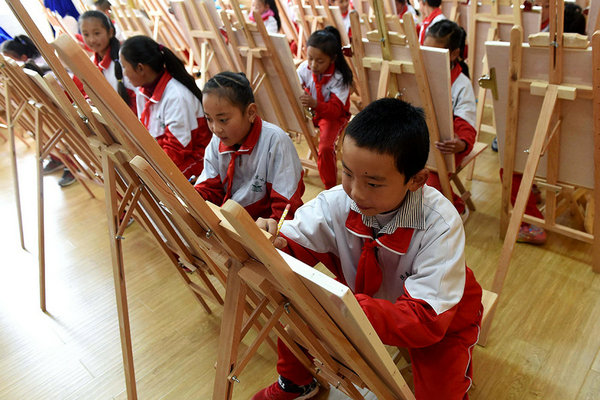 3月27日,独克宗小学的藏族男孩黄伟(右一)和同学在绘画兴趣班上画画。