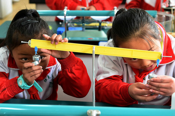 3月27日,独克宗小学的两名藏族女学生在科学实验课上。