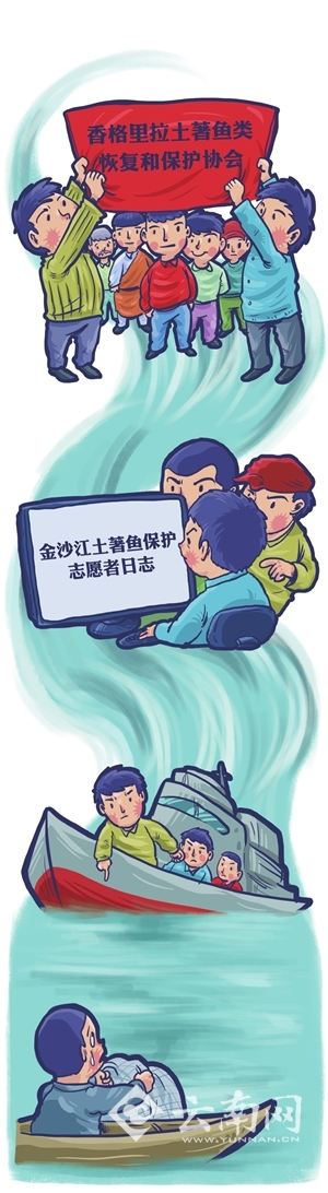 2015年11月,香格里拉企业家屈天文牵头成立了“香格里拉土著鱼类恢复和保护协会”。从此,在金沙江上游奔子栏至虎跳峡段的干、支流江面上,随时都能看到“香格里拉土著鱼类恢复和保护协会”成员和志愿者的活跃身影。他们与迪庆、丽江两州市的渔政、公安部门和乡村组织、当地群众密切配合,积极开展土著鱼类保护的宣传动员、土著鱼类增殖放流和全天候巡逻活动,在金沙江两岸有声有色地开展土著鱼类恢复和保护工作。