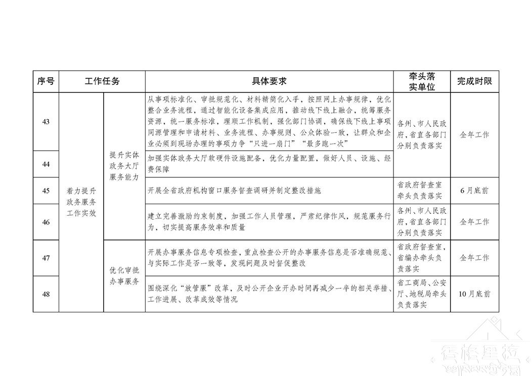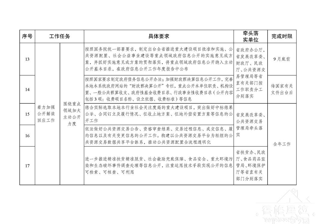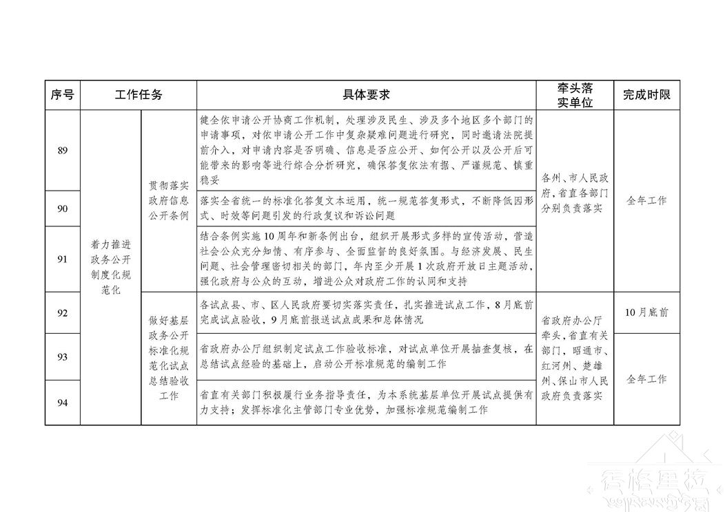 各级政府及部门办公厅(室)要切实承担起本地本部门政务公开工作的组织推动、统筹协调、督促检查主体责任,按照“年布局、季统筹、月计划、周安排、日对照”工作思路,坚持事前谋划、事中督导、事后总结,有力有序推进本地本部门政务公开各项工作;要对照分工方案将责任落实到具体部门、落实到具体责任人。有关牵头单位要按照“谁牵头负责、谁组织落实”的原则,不断强化对本系统本行业政务公开工作的指导、督促和检查,加强上下联动、横向协调,增强合力;要紧盯国家政务公开最新部署,依法依规推进,立足自身职能加强调查研究和统筹协调,及时掌握进展情况,及时协调解决遇到的困难和问题。有关责任单位要根据职能分工,进一步细化分解任务,确保各项目标任务按时完成。同一事项由多个部门共同完成的,牵头部门要做好统筹协调,形成齐抓共管、共同推进的工作格局,防止出现工作遗漏。