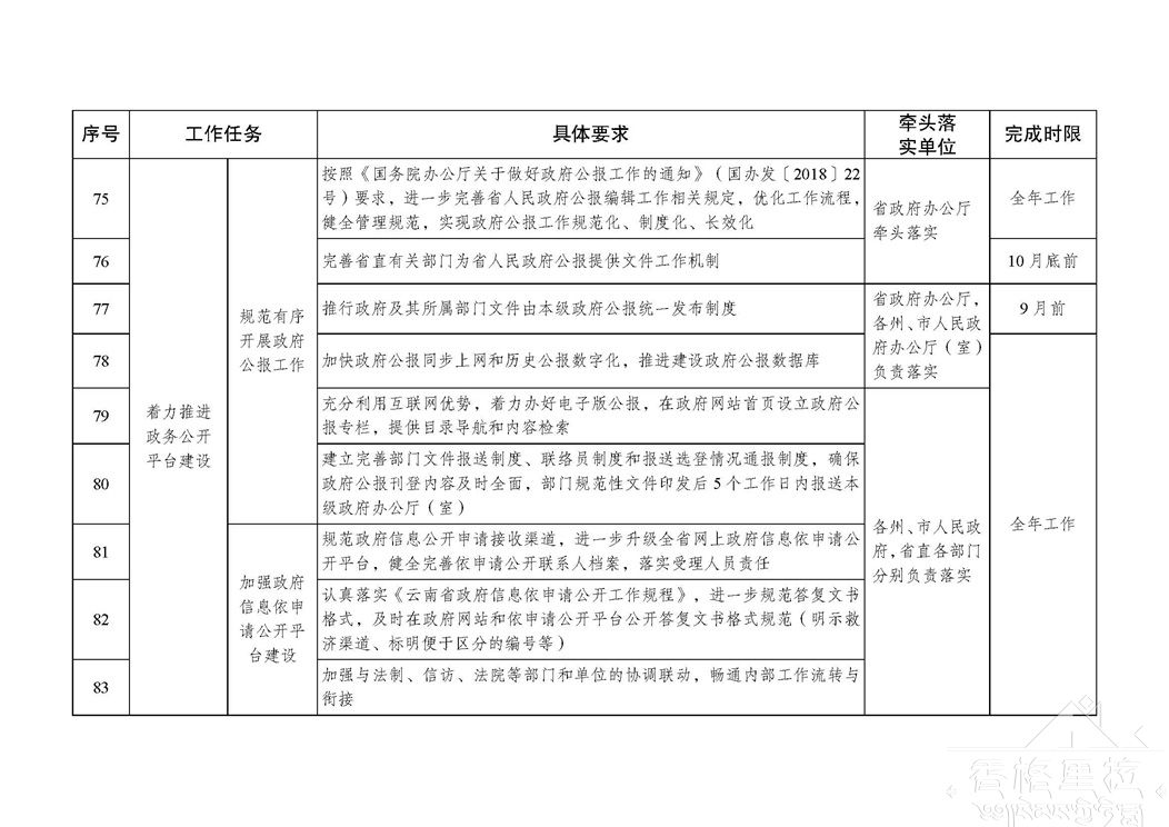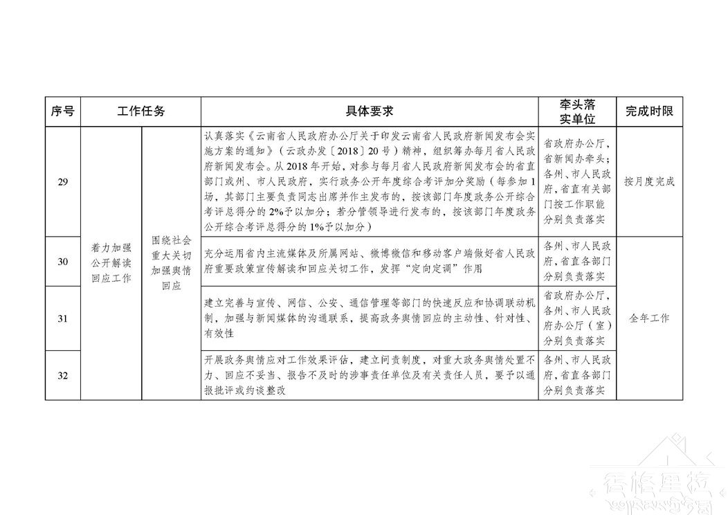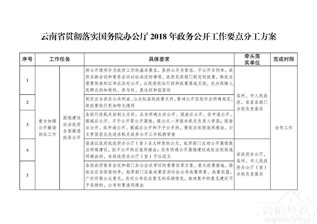 《云南省贯彻落实国务院办公厅2018年政务公开工作要点分工方案》(以下简称分工方案)已经省人民政府同意,现印发给你们,并提出以下要求,请认真贯彻执行。
