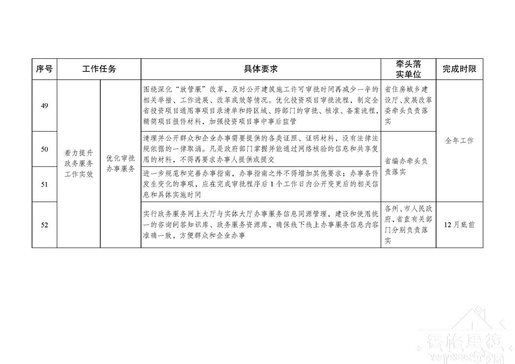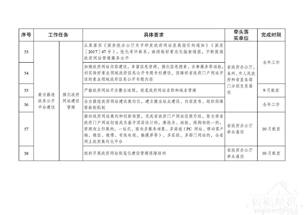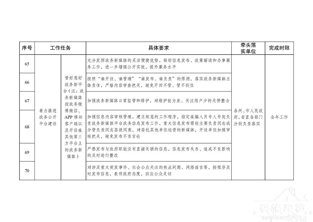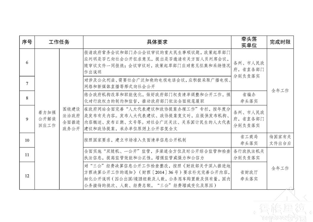 推进政务公开是全面贯彻党的十九大和十九届二中、三中全会精神,促进法治政府、创新政府、廉洁政府和服务型政府建设的重要举措和必然要求,是各级政府及其部门义不容辞的责任。各地各部门要以习近平新时代中国特色社会主义思想为指引,深入贯彻落实党中央、国务院和省委、省政府重要决策部署,切实将全面推进政务公开工作列入重要议事日程,真正把政务公开工作与本地本部门的中心工作同研究、同部署、同考核、同推进,着力加强公开解读回应工作,着力提升政务服务工作实效,着力强化公开平台建设管理,着力推进政务公开制度化规范化,确保年度政务公开各项工作任务落实到位。各地各部门主要负责同志每年至少听取1次政务公开工作汇报,研究部署推进工作;确定1位负责同志分管政务公开工作,列入工作分工并对外公布。要全面加强政务公开工作力量配置,各州、市人民政府要在办公厅(室)完善专门工作机构,省直各部门要明确工作承担机构,加快配齐配强专职工作人员。对年内仍未建立专门工作机构的州、市和未明确工作承担机构的省直部门,在政务公开年度综合考评中实行“一票否决”。