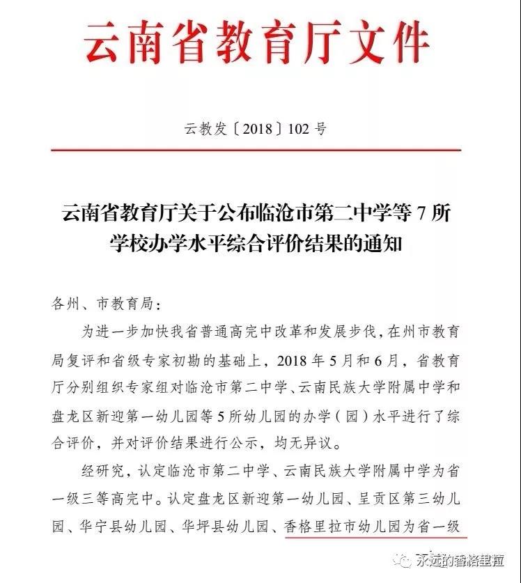 香格里拉市幼儿园被认定为省一级一等幼儿园