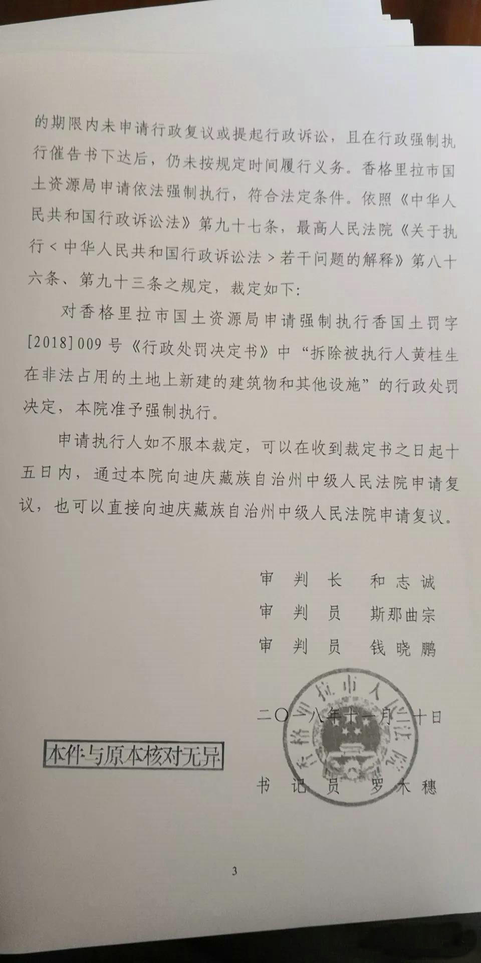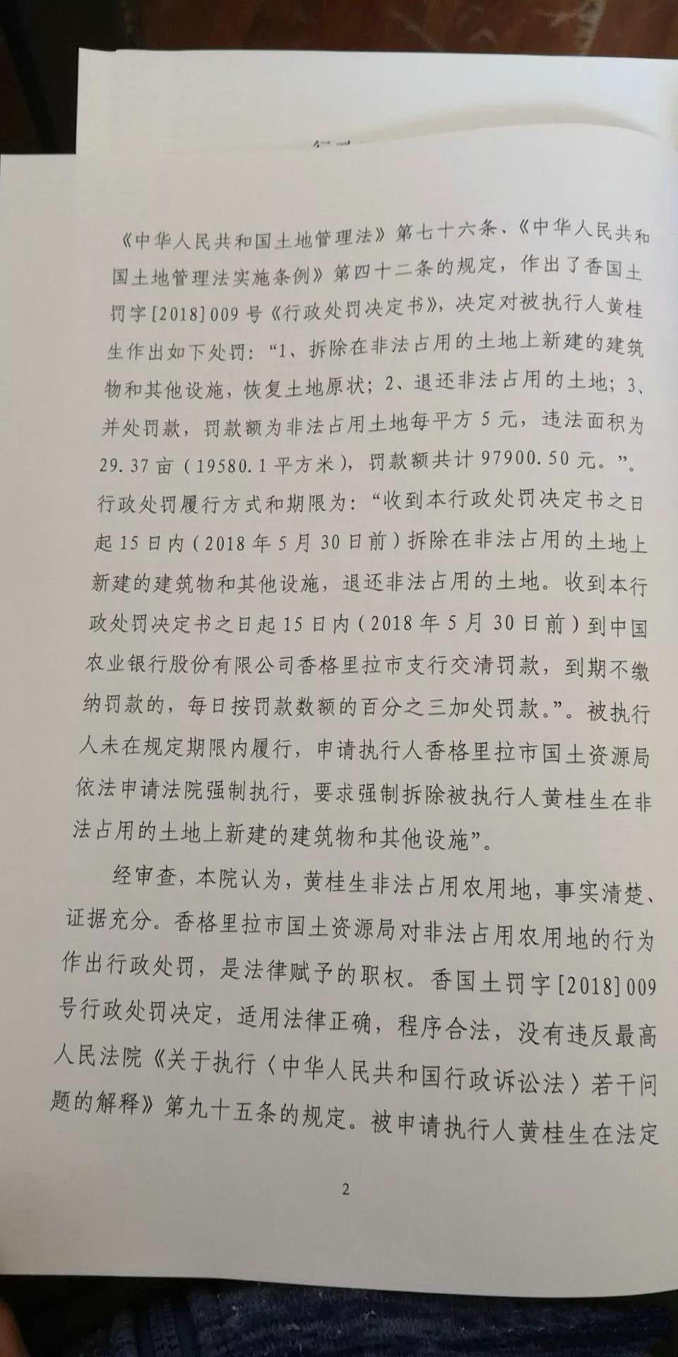 据悉,香格里拉市第一轮土地整治中依法査处的德通驾校黄桂生非法占用农用地一案,2018年1月18日香格里拉市人民法院依法作出了刑事判决,2018年5月14日香格里拉市国土资源局依法作出《行政处罚决定书》,要求黄桂生拆除在非法占用士地上的建筑物和其他设施,黄桂生迟迟不履行处罚決定。2018年8月28日,香格里拉市国土资源局依法向香格里拉市人民法院申请行政强制执行,2018年11月20日香格里拉市人民法院依法作出(2018)云3401行审1号《行政裁定书》,准予强制执行黄桂生在非法占用的土地上新建的建筑物和其他设施。