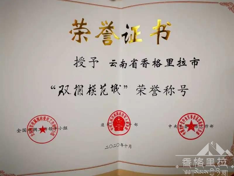10月20日上午,全国双拥模范城(县)命名暨双拥模范单位和个人表彰大会云南分会场在省人民政府召开。香格里拉市再次被命名表彰为“全国双拥模范城”,顺利实现争创“三连冠”奋斗目标。