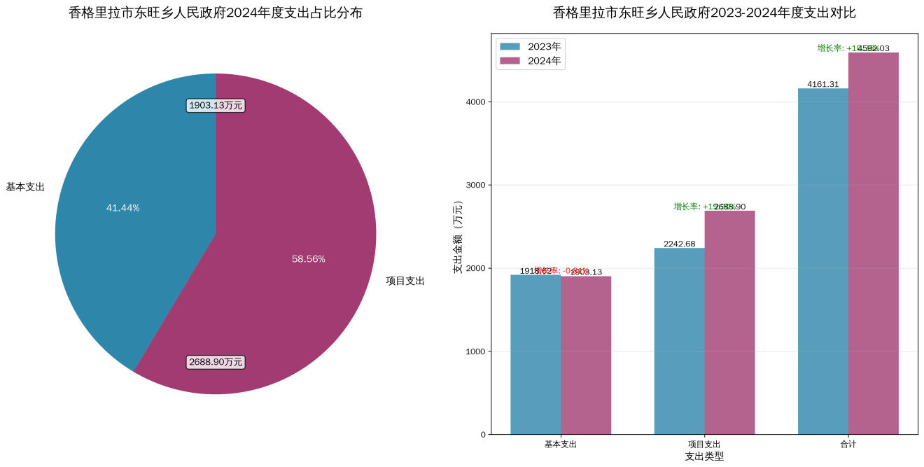 香格里拉市东旺乡人民政府2024年度支出合计45920338.53元。其中:基本支出19031342.40元,占总支出的41.44%;项目支出26888996.13元,占总支出的58.56%;无上缴上级支出;无经营支出;无对附属单位补助支出。