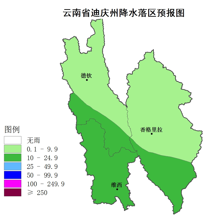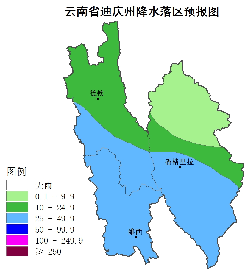 预计2021年10月21~22日我市将出现一次强降水天气过程:21日南部中到大雨,其它地区海拔3500米以下小雨,海拔3500米以上地区中雪;22日香格里拉市中南部大雨,其它地区海拔3500米以下中到大雨,海拔3500米以上地区大雪;23日白天转为多云天气为主。累计雨量: 20~50mm,最大小时雨强10~15mm,需防范持续降雨、单点性强降水,海拔较高地区降雪对各行业造成不利影响。