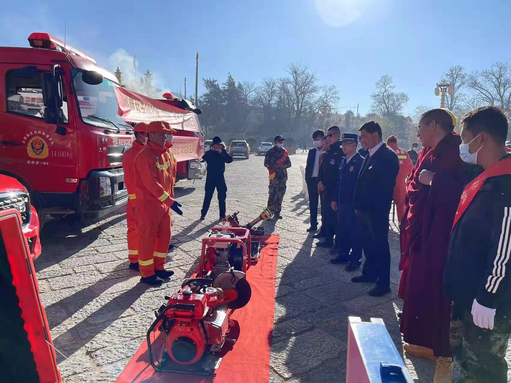 此次仪式共分为五项仪式:第一项仪式由管理局副局长肖巴同志进行发言和消防员启动仪式;第二项进行消防器材展示参观,第三项请尼旺宗消防救援站指战员对消防装备进行操作解说;第四项结合相关解说的理论知识开始进行实地培训以及演练,并通过发放宣传册进一步巩固相关理论知识;第五项部门联合对寺院进行了安全隐患大排查,防止出现安全隐患事故。
