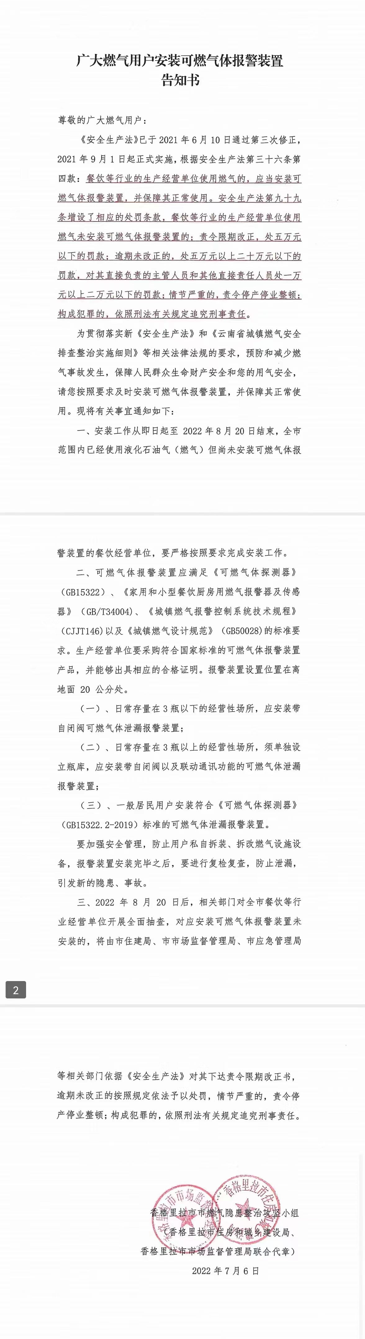 为贯彻落实新《安全生产法》和《云南省城镇燃气安全排查整治实施细则》等相关法律法规的要求,预防和减少燃气事故发生,保障人民群众生命财产安全和您的用气安全,请您按照要求及时安装可燃气体报警装置,并保障其正常使用。现将有关事宜通知如下: