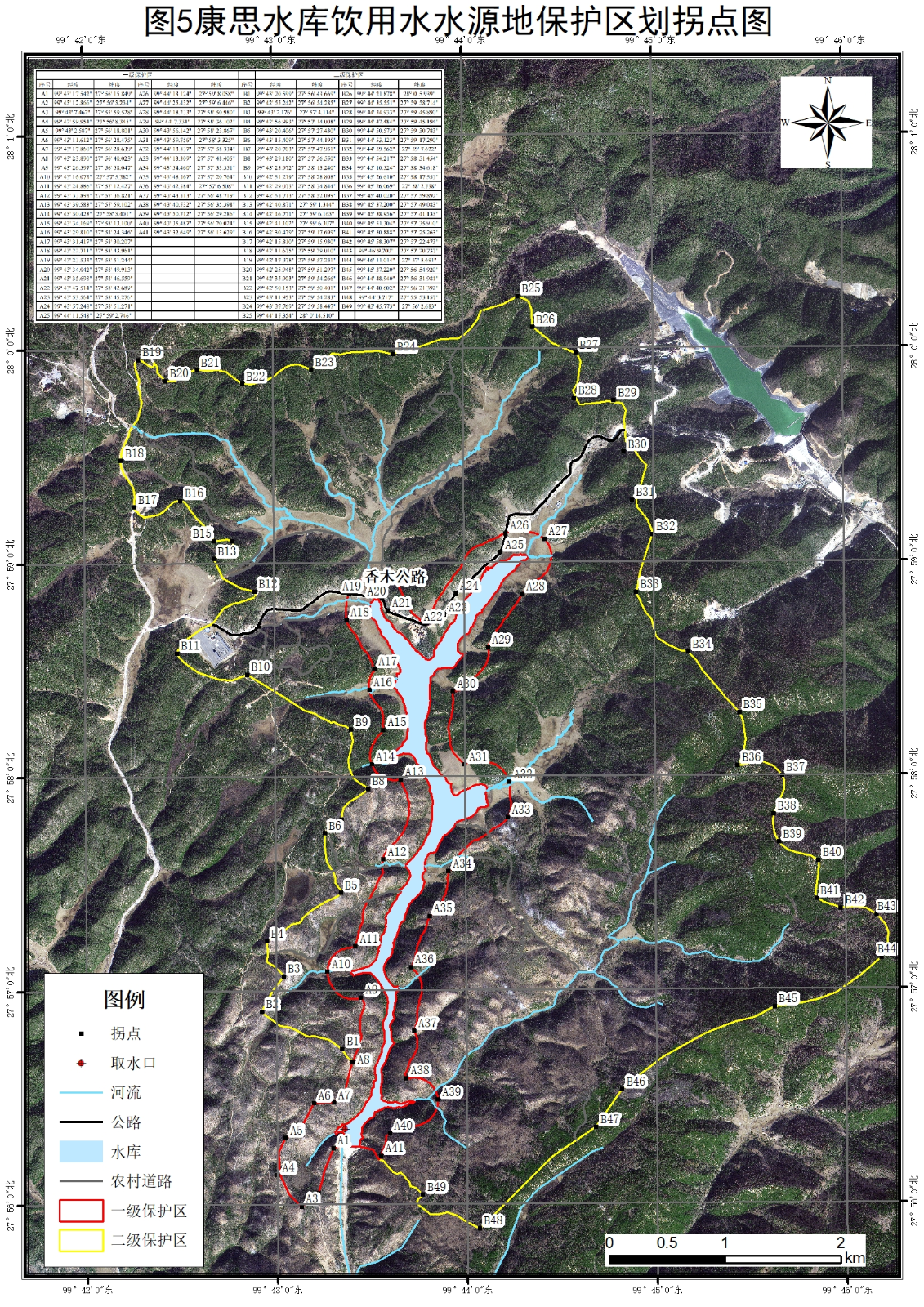 一级保护区为整个康思水库库区正常蓄水位3455.10m以下水面划为一级保护区水域,面积0.976km2;一级保护区水域外延200m同时在坝址处向内收缩至大坝、坝址右岸外延至分水岭的区域划定一级保护区陆域,面积3.301km2。
