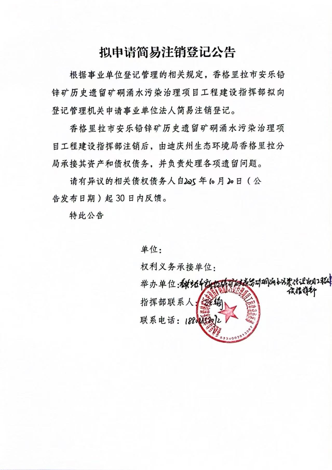 香格里拉市安乐铅锌矿历史遗留矿硐涌水污染治理项目工程建设指挥部注销公告