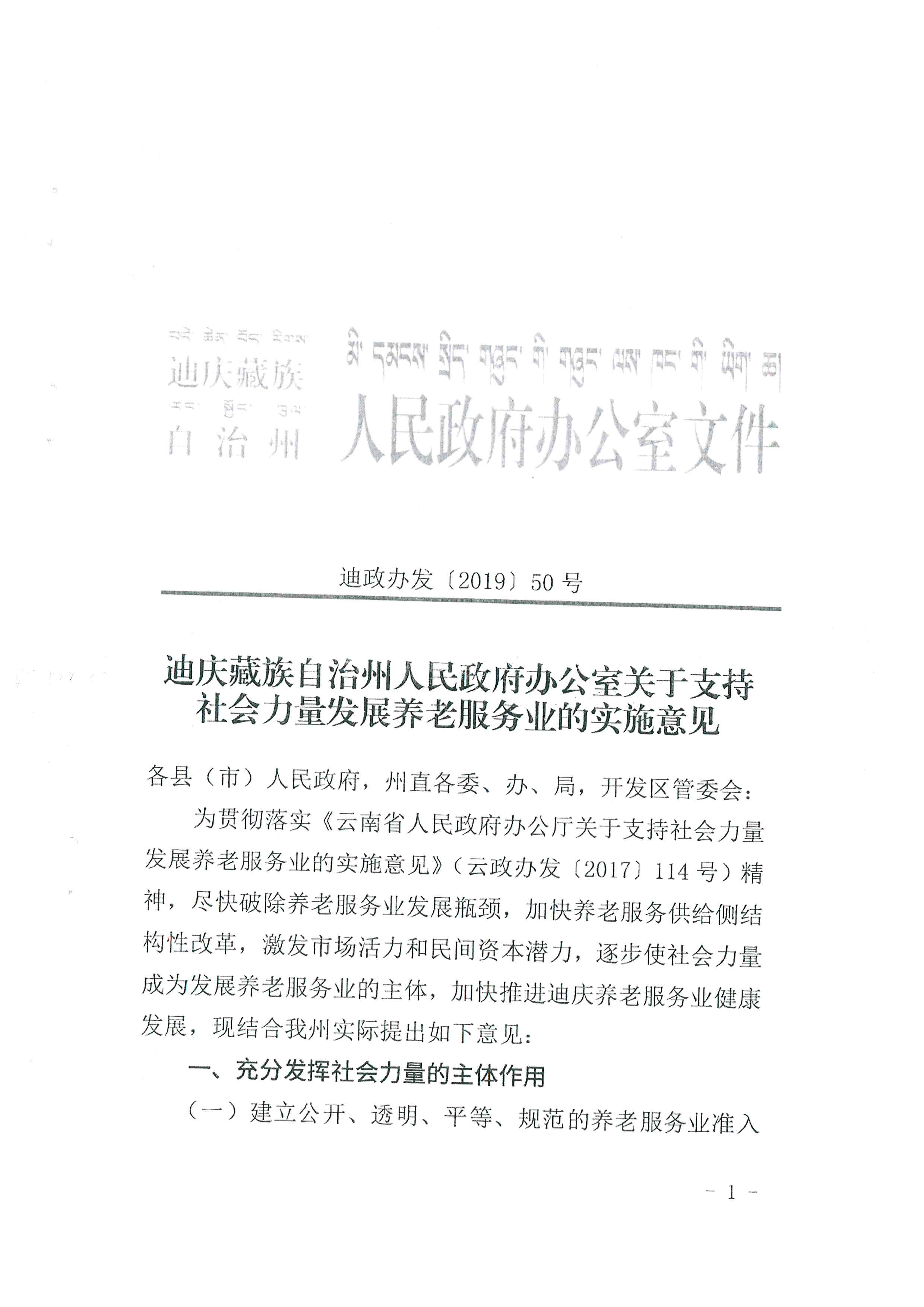 【养老服务】迪庆藏族自治州人民政府办公室关于支持社会力量发展养老服务业的实施意见