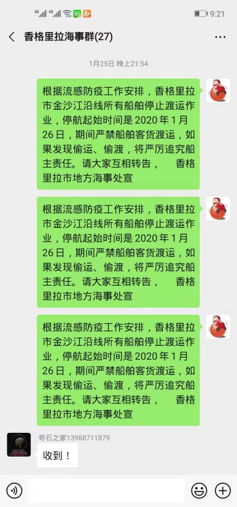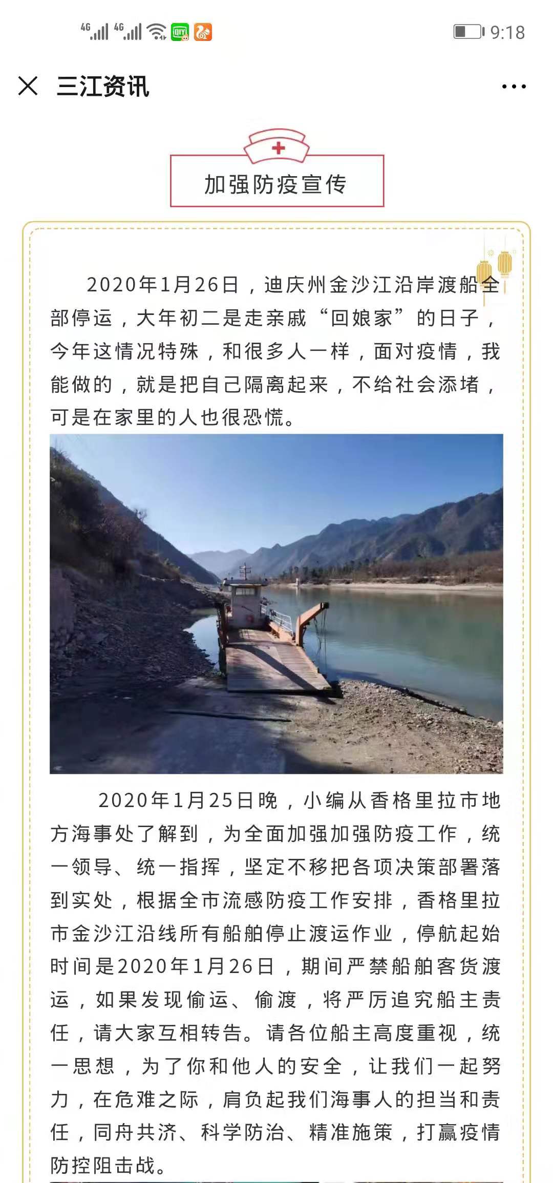 2020年1月25日我香格里拉市地方海事处接到丽江市计划封闭通往香格里拉市各沿江大桥的通知,通过进一步了解,新型冠状病毒感染的肺炎传染性高,有潜伏期,病毒致命,形势非常严峻。