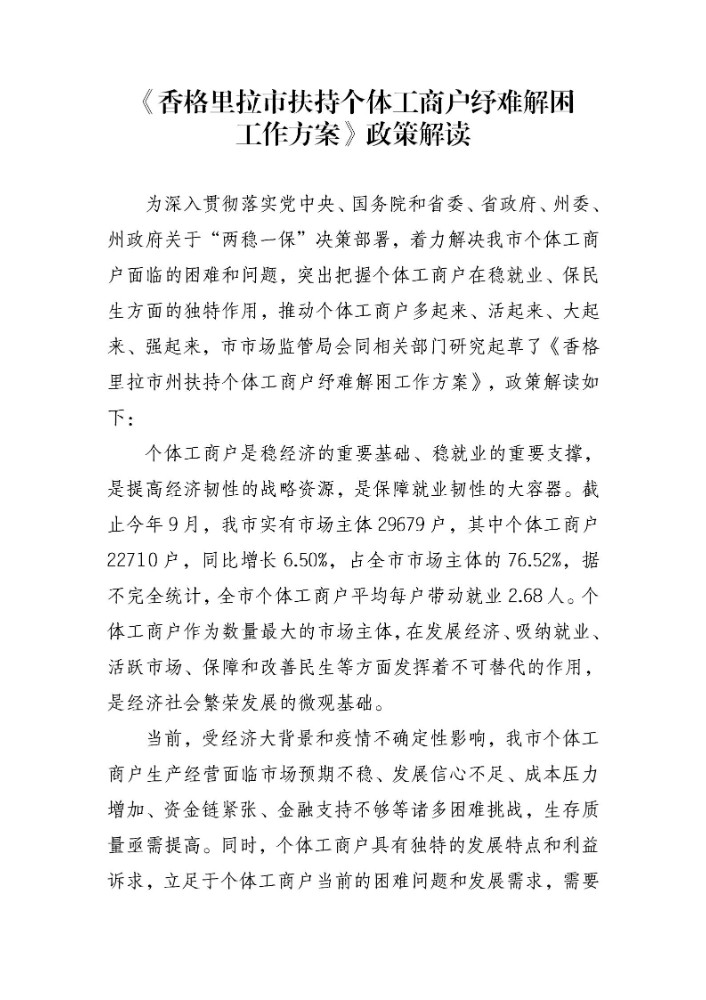 关于《香格里拉市扶持个体工商户纾难解困工作方案》政策解读