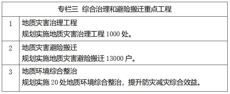 ——地质灾害隐患威胁和风险明显降低。完成对重要人口聚集区和高、中风险区地质灾害治理工程1000处,避险搬迁13000户,选择20处受地质灾害严重威胁的城镇和灾害集中连片发育的典型小流域,试点探索地质环境综合整治,加强源头防控,明显降低地质灾害隐患威胁和风险。
