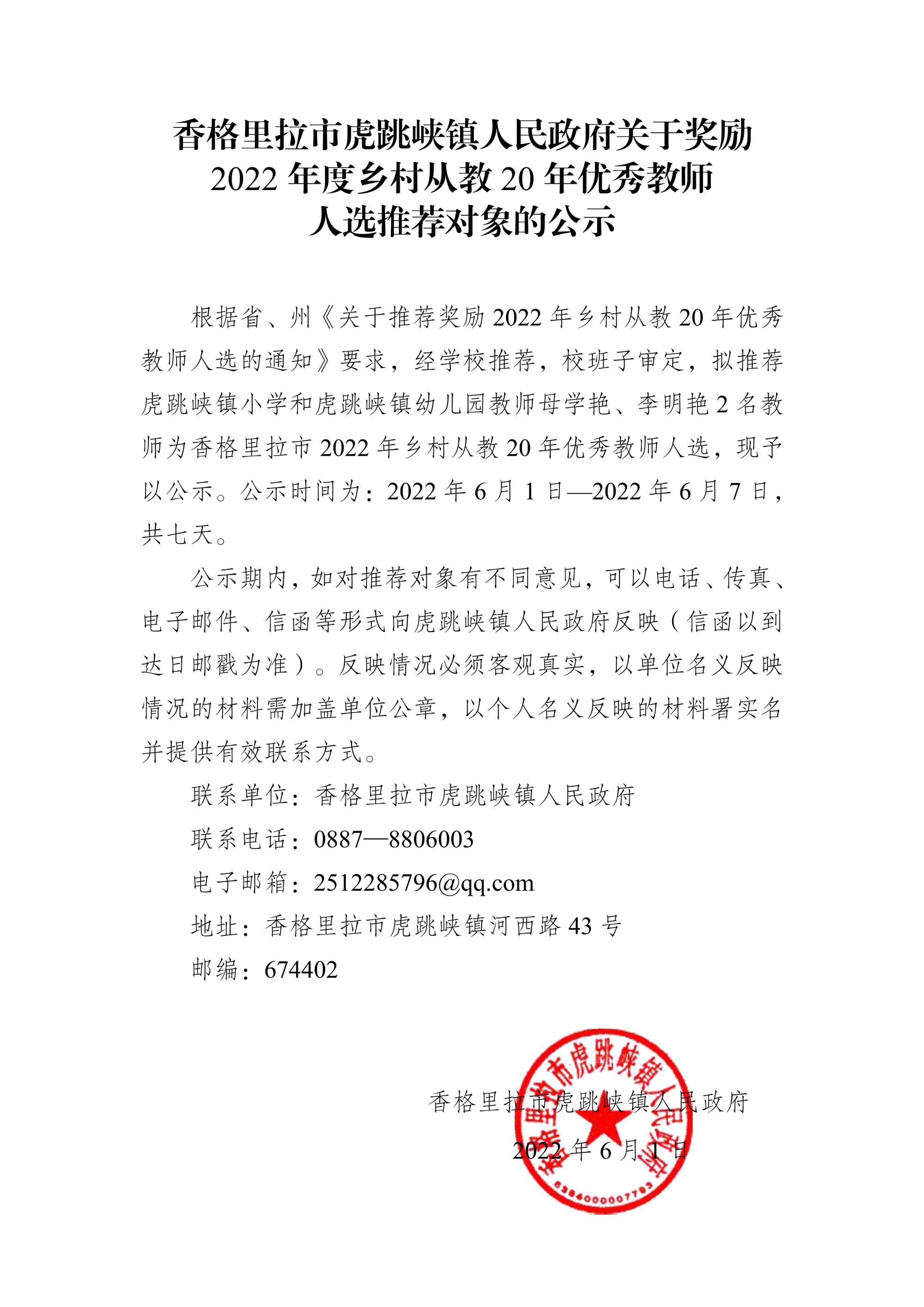 香格里拉市虎跳峡镇人民政府关于奖励2022年度乡村从教20年优秀教师人选推荐对象的公示(1).pdf