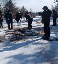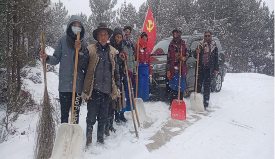 1月28日,连夜的大雪再次把前一天刚清扫完的道路覆盖,道路轮廓完全无法辨别,部分阴坡道路积雪已被牢牢冻住,给积雪清扫工作增加了难度。在党总支的号召下,古仁等11个党支部组织党员开展道路清雪工作,在结冰严重的路段洒上泥土,防止车辆发生事故,在众人努力下,吉迪、孜尼两条进村公路又恢复了通行。