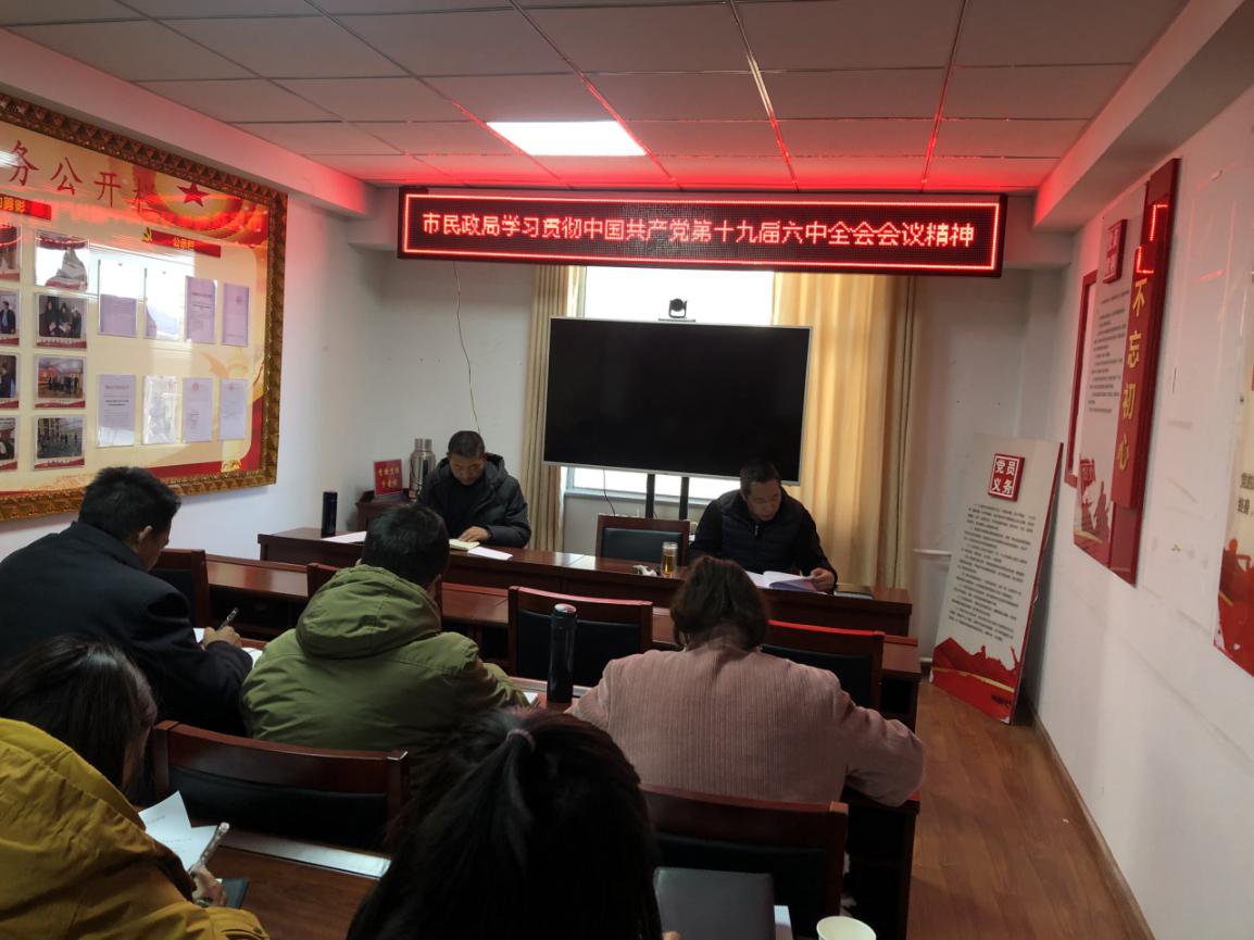 香格里拉市民政局党组书记、局长楚玉华主持会议,会议上着重强调了以下内容:一是要强化政治机关意识、走好第一方阵;二是要强化党建与业务深度融合,解决“两张皮”的问题。持续巩固脱贫攻坚兜底保障成果,加快基本养老服务体系建设,扎实做好儿童福利和未成年人保护工作,加强基层政权建设和区划地名管理,不断提升社会事务服务质效,促进社会组织高质量发展;三是要强化工作方式改进运用,推动工作落地见效。同时,传达学习了第十九届六中全会精神,云南省第十一次党代会精神。
