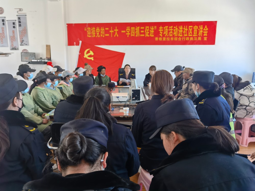 为深入抓好“迎接党的二十大 一学四抓三促进”专项活动学习宣讲工作落实,2022年3月11日市综合行政执法局组织党员10人到结对小区香巴拉小镇开展宣讲活动。