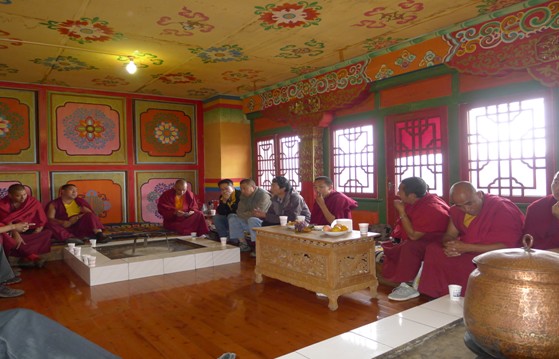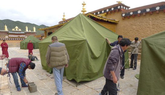 松赞林寺抗震救灾工作组在完成客观实际的灾情统计后,安抚僧众情绪,积极引导僧众进行生产自救,虽然8.31地震对寺院并未造成很大财产损失,但对他们心理及生产生活带来了一定的影响,工作组根据寺管会建议,分片分组对各康惨在寺僧人进行情绪引导,尼旺宗派出所每晚2次对寺院进行巡查,进入僧舍对老弱病残进行嘘寒问暖,把党的温暖带给他们,为了减轻党委政府的负担,寺管会积极联系爱心企业,得到了丽江束河古道藏家捐赠帐篷19顶,军用折叠床19个,为了做好预防工作,防患于未然,工作组为疏散僧众搭建帐篷10顶,并发放帐篷8顶到8大康参,已备急时之需。