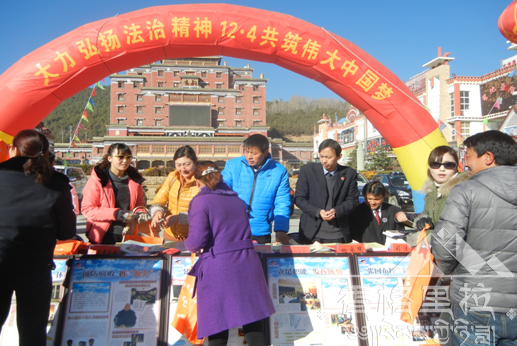 12月4日上午,香格里拉县司法局、检察院、法院、公安局、城市管理综合执法局、县委普法办、县旅游局的40余名工作人员在坛城广场开展了以“大力弘扬法治精神12·4共筑伟大中国梦”为主题的大型法制宣传活动。各街镇乡和县直各部门相应设立了宣传点。宣传活动采取广播宣传、悬挂横幅标语、散发法律法规宣传资料、现场法律咨询解答等多种形式进行。此次活动共向群众散发法律宣传资料2000余份,其中有《中华人民共和国旅游法》、《云南省法律援助条例》、《预防艾滋病知识宣传》、《“六五”普法》、《城市管理办法》等,摆放宣传展板20余块,解答涉法问题100余条。此次宣传活动的开展对进一步增强公民的法律意识和法制观念,发挥了积极作用。