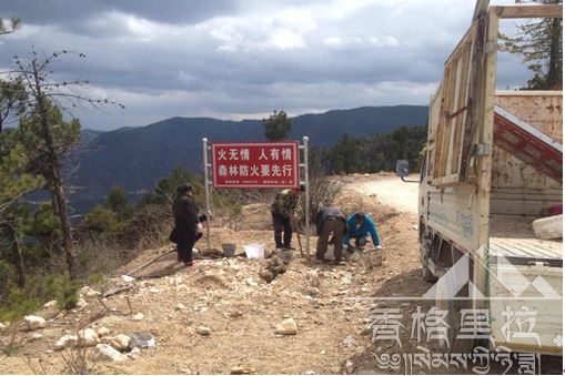 图为格咱林场工作人员正在竖立森林防火宣传牌