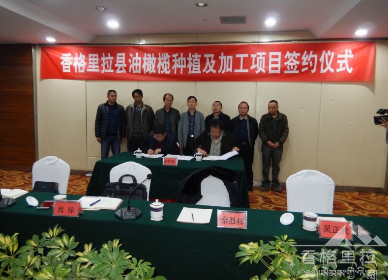 2015年3月16日上午,签约仪式在香格里拉县城天界神川酒店会议室举行,出席签约仪式的我方领导有:州委常委、香格里拉县委书记余胜祥;香格里拉县长肖徐;州林业局局长吴正武;州招商合作局局长郭士林;香格里拉县副县长和雨及州扶贫办领导、香格里拉县人大、政协、林业、发改、水电、工信、农科、规划、移民、金江镇、虎跳峡镇、东旺乡、三坝乡、上江乡、五境乡、尼西乡等主要领导。出席签约仪式的甘肃陇南田园油橄榄科技开发有限公司董事长白小勇及其他人员一行五人。香格里拉县人民政府县长肖徐代表甲方签字,甘肃陇南田园油橄榄科技开发有限公司董事长白小勇代表乙方签字,见证领导分别有:余胜祥书记、吴正武局长、郭士林局长、和雨副县长、人大、州扶贫办领导及甘肃陇南田园油橄榄科技开发有限公司高经理。