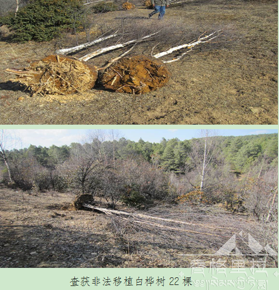 建塘林业综合行政执法中队在环境综合整治行动工作中,充分发挥林业生态文明建设作用,大力宣传保护林业生态环境的重要意义,营造全社会动员、全民参与,充分调动和激发广大群众保护林业生态环境的热情,增强群众保护林业生态环境的意识。在正确处理好发展与生态保护的关系,建塘林业综合行政执法中队全面加强森林资源保护工作。建塘林业综合行政执法中队在对森林资源巡查、巡护中发现帕叉丫口安伍非法移植白桦树22棵。对当事人已按照《森林法》有关规定进行处理。(建塘林场站)