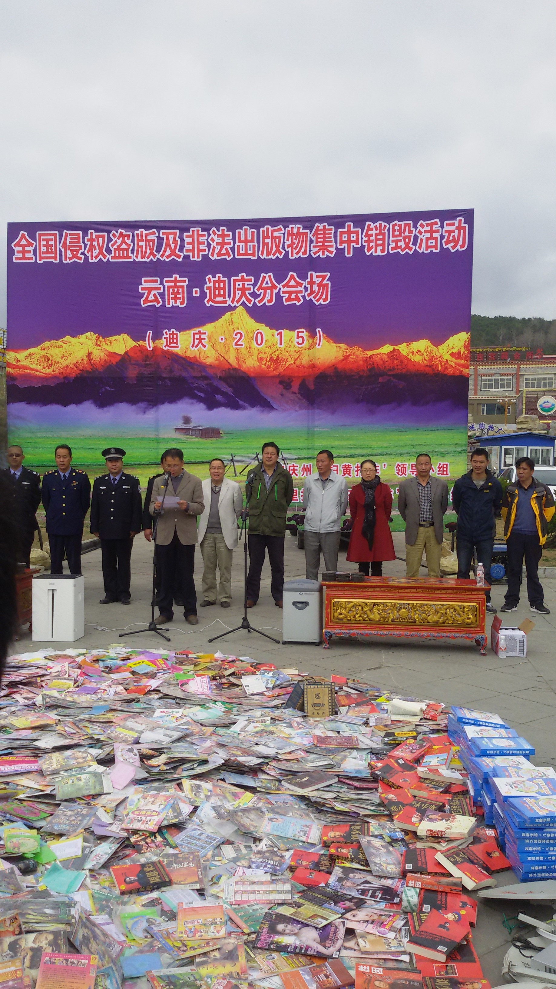 根据省“扫黄打非”工作领导小组办公室《关于开展2015年侵权盗版及非法出版物集中销毁的通知》要求,迪庆州“扫黄打非”领导小组及香格里拉县“扫黄打非”领导小组于2015年4月24日在坛城广场共同举行全国侵权盗版及非法出版物集中销毁活动。州县宣传部、政府、文化、公安、工商、知识产权、海关、国家安全局、综合行政执法局等工作成员单位及“扫黄打非”办公室负责人,部分文化市场经营单位业主,参加了此次宣传及销毁活动。