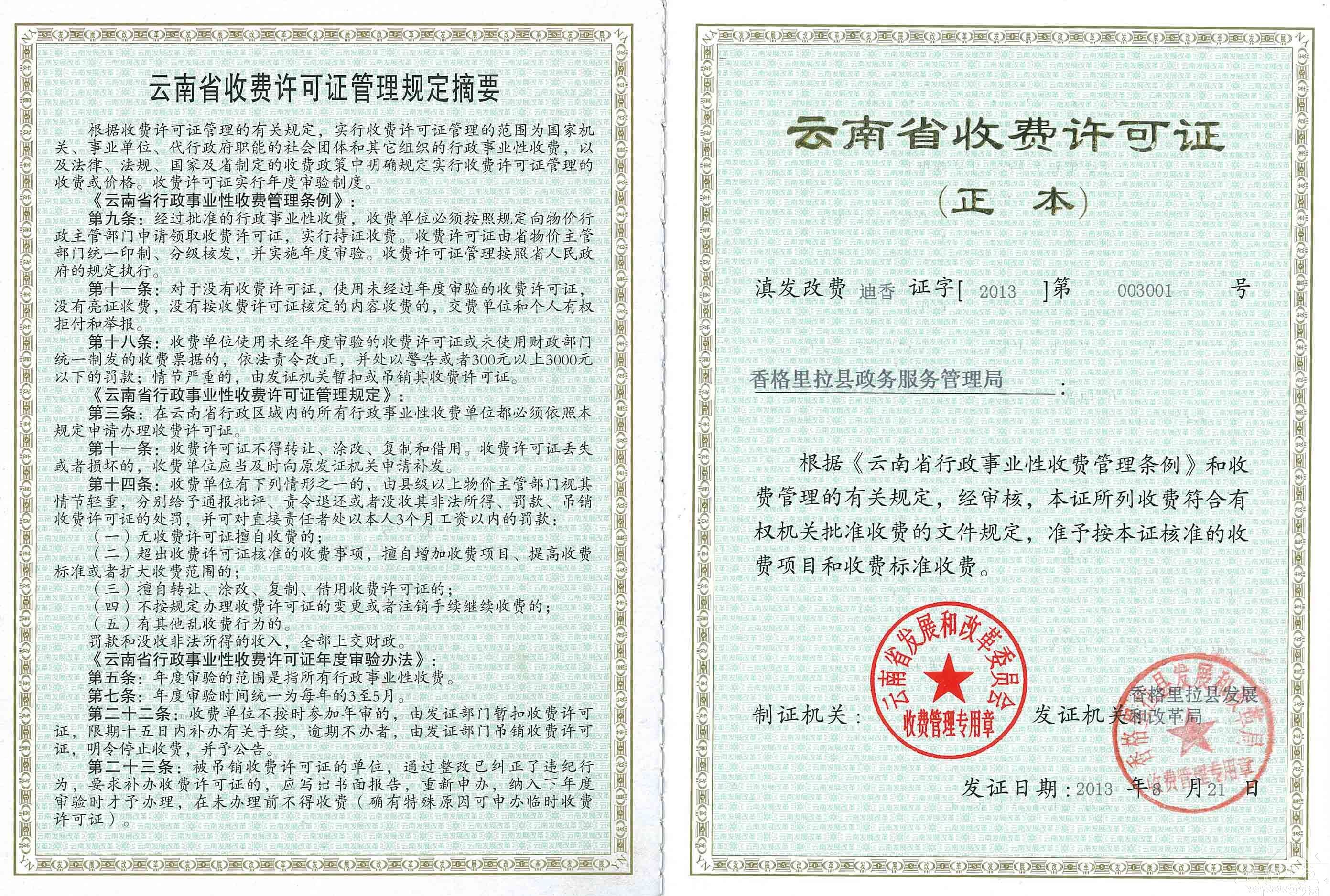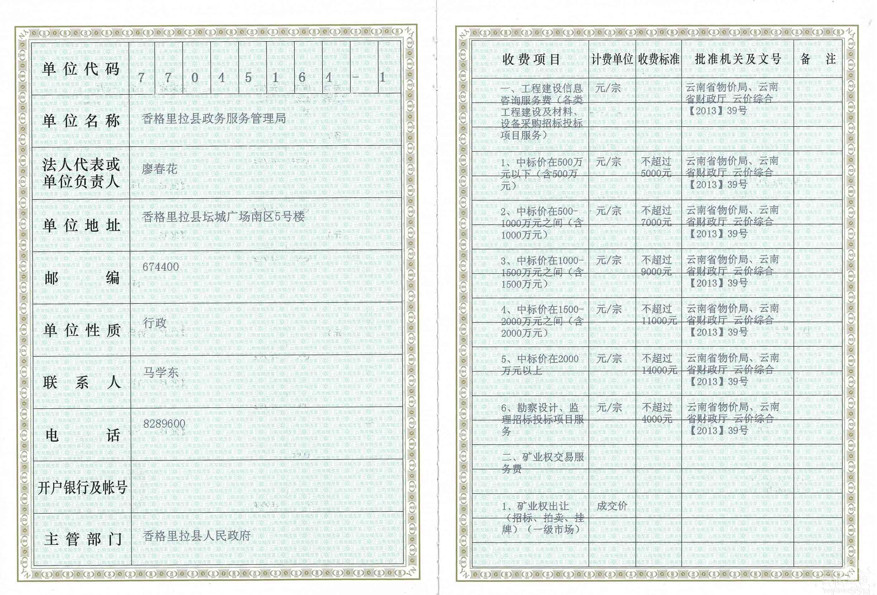 【政务服务管理局】香格里拉市政务服务管理局收费项目公示