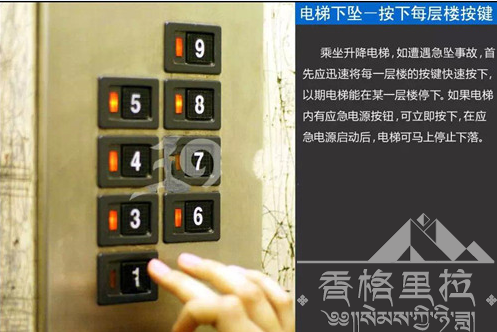 第一、(不论有几层楼)赶快把每一层楼的按键都按下。(切记要从底部往上按,最快的速度全按亮,哪怕不亮也都按)。因为当紧急电源启动时,电梯可以马上停止继续下坠。