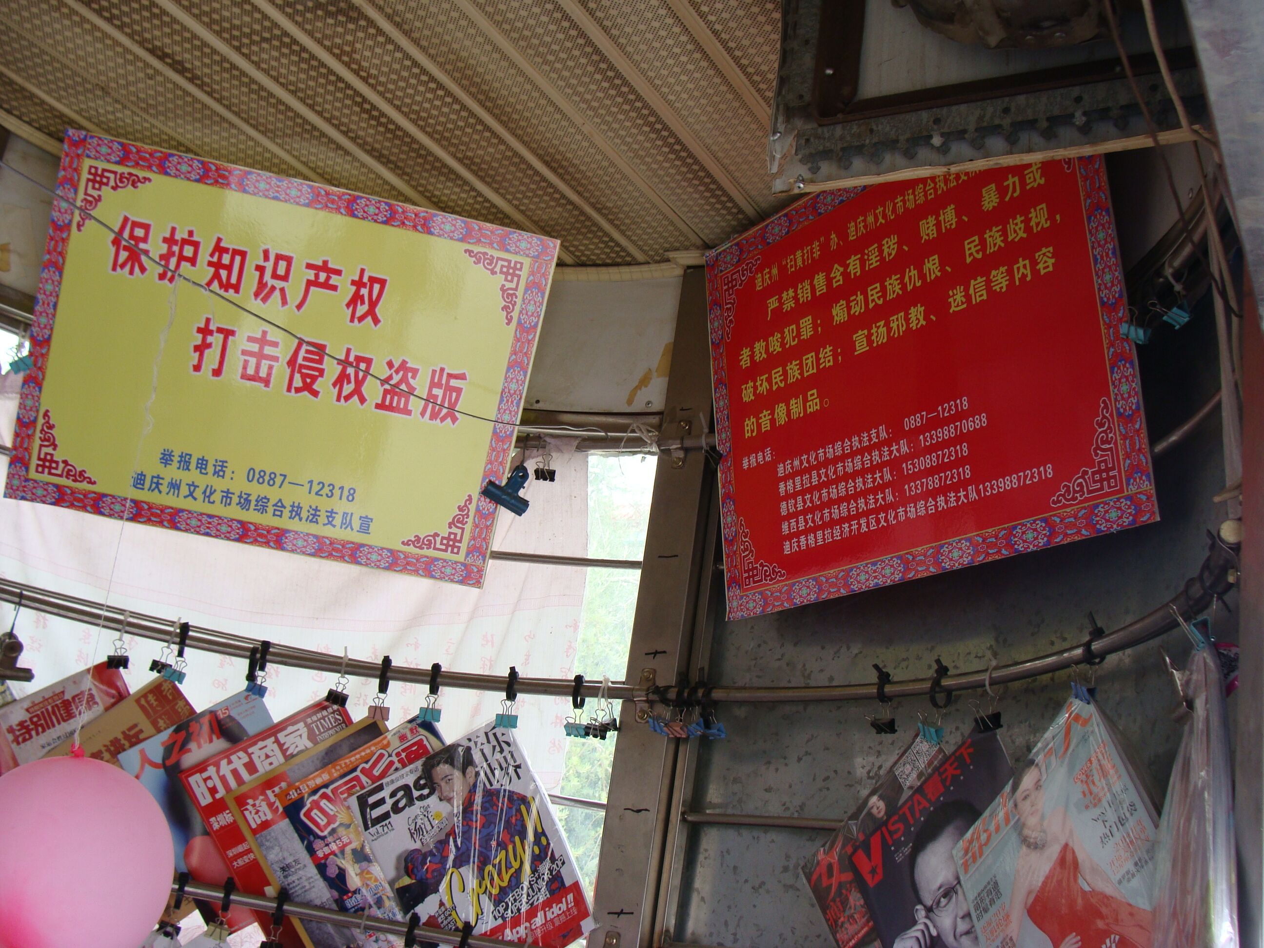 2015年8月17日—8月21日,香格里拉市综合行政执法局执法人员认真对照三份密电的查缴目录和此次通知查缴的非法报刊名单,对我市城区图书报刊的零售门店和车站、医院、学校、市场附近的书刊亭进行全面清查,经过执法人员检查,发现迪庆顺腾文化发展有限公司及他旗下的二市场报刊亭、坛城报刊亭涉嫌零售“西江文艺”、探索揭秘、大揭秘等非法出版物,执法人员当即填写了现场检查﹙勘验﹚笔录,对这三家书报刊亭下达了责令改正通知书,开具了证据先行登记物品清单,共证据保全非法出版物共计24本。执法人员还详细询问了顺腾文化发展有限公司负责人供货商的详细地址、联系人、联系电话。截至目前,其余8家书店及报刊亭未发现通知公布的政治性有害出版物。