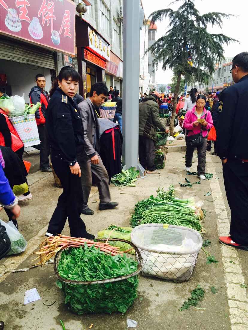 2015年9月29日上午7时30分香格里拉市综合行政执法局城管执法大队全体队员整装待发,由任忠义局长、杨卫军副局长带队严厉整治向阳路两侧蔬菜倒卖流动摊贩。