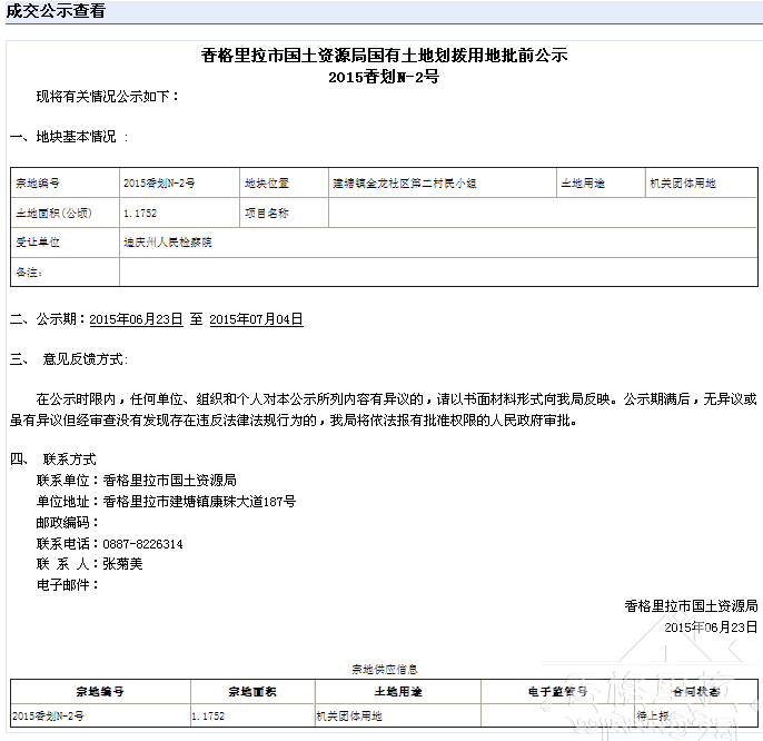 【自然资源局】国有土地划拨用地批前公示-2015香划N-2 号