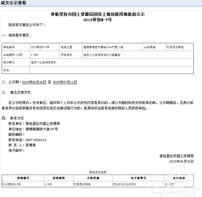 【自然资源局】国有土地划拨用地批前公示-2015香划N-7号