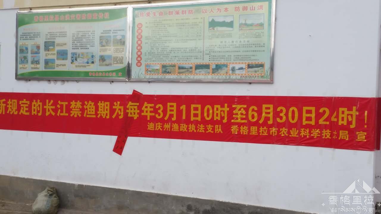 根据《农业部关于调整长江流域禁渔期制度的通告》(农业部通告[2015]1号),2016年长江流域禁渔期制度作了调整,禁渔时间为3月1日0时至6月30日24时,为加强禁渔期管理,落实组织领导,做好宣传工作,更好地开展2016年的长江禁渔工作,进一步保护好长江渔业资源,遏制资源不断衰退的趋势,确保长江渔业经济可持续发展,2016年3月7日—3月11日,迪庆州农牧、州渔政执法支队及香格里拉市渔政渔港监督管理站的执法人员,对迪庆州禁渔区域德钦县羊拉乡羊拉村登拉至香格里拉市洛吉乡三江口的长江470公里干流及支流所涉及的乡镇及宾馆加强了宣传活动工作。此次宣传,出动宣传车辆2辆,行程一千多公里,对沿江一线的餐馆及销售渔具店铺发放禁渔宣传资料200份,并对87家餐馆进行了长江禁渔期制度宣传告知登记。发放渔业法规170本。在各乡镇村委会及人群比较集中的地方张贴通告100份,播放《中华人民共和国渔业法》及《云南省渔业条例》。悬挂禁渔宣传横幅标语41条。