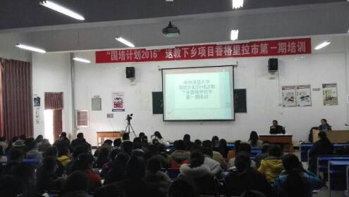 为贯彻落实《国务院办公厅关于印发乡村教师支持计划(2015-2016年)的通知》(国办发[2015]43号)和《教育部财政部关于改革实施中小学幼儿园教师国家级培训计划的通知》(教师[2015]10号)相关要求。扎实推进香格里拉市教师网络研修与校本研修整合培训,形成网络支持下校本研修良性运行机制,切实提升全市教师校本研修能力。2016年4月12日至15日,香格里拉市教师进修学校和华中师范大学联合组织开展“国培计划2016”送教下乡项目教师网络研修培训活动。全市各中小学、幼儿园教学副校长,教研室主任、信息技术员、名师工作室主持人及成员教师等200多人参加了此次培训。