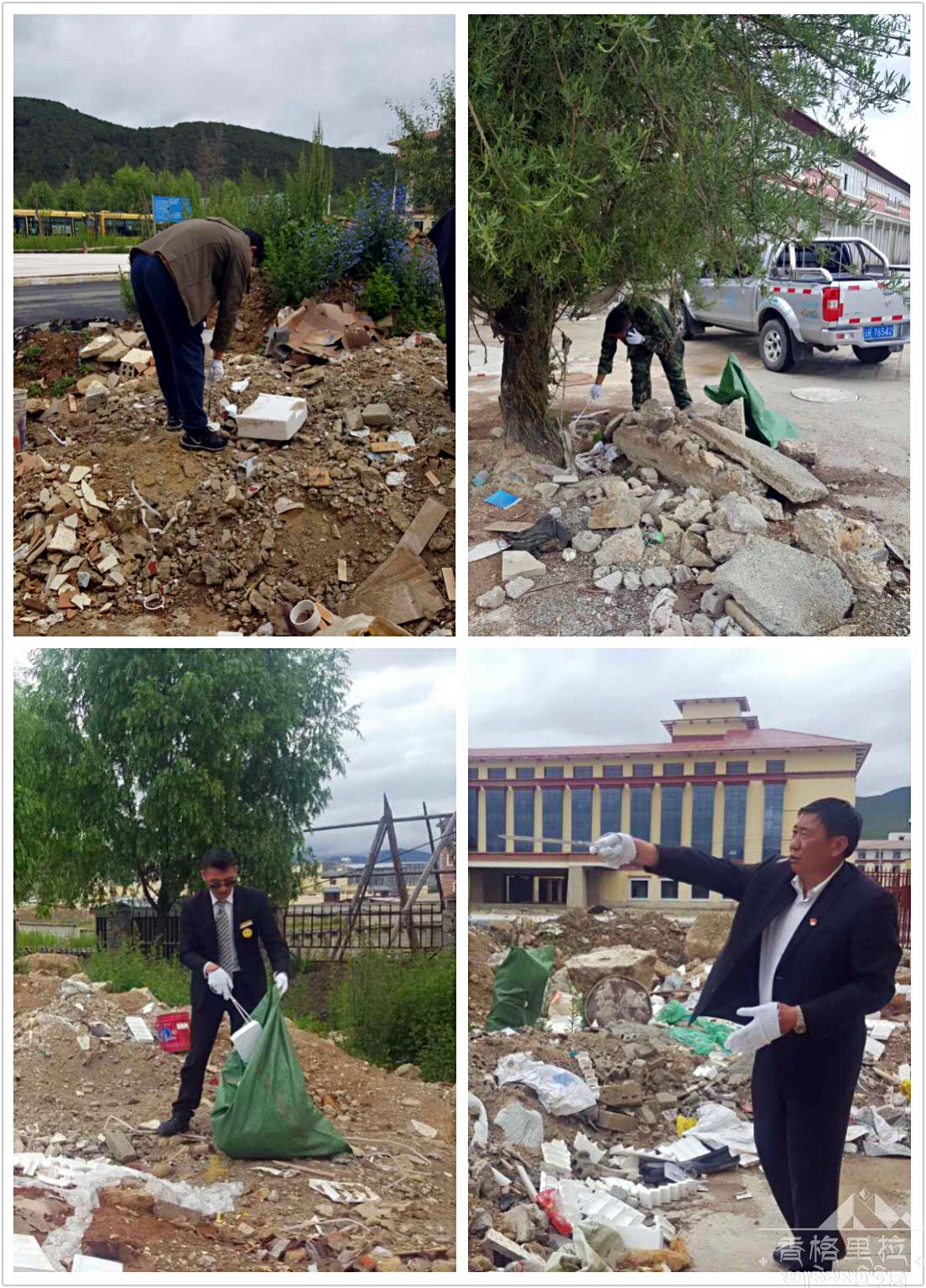 在劳动中,党员们不怕累,不怕脏,齐心协力,共同动手,以实际行动迎接党的生日到来。经过半天的辛勤劳动,清理了游客中心停车场、通景公路两侧、拉姆央措湖环湖栈道及寺院周边的杂草、垃圾。